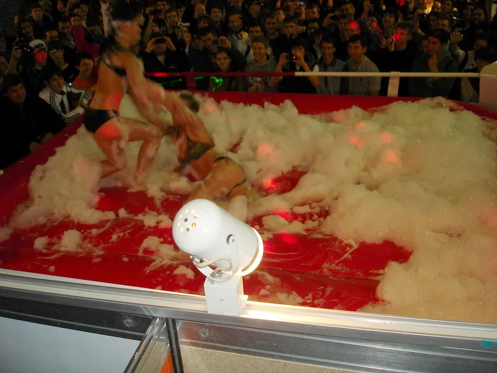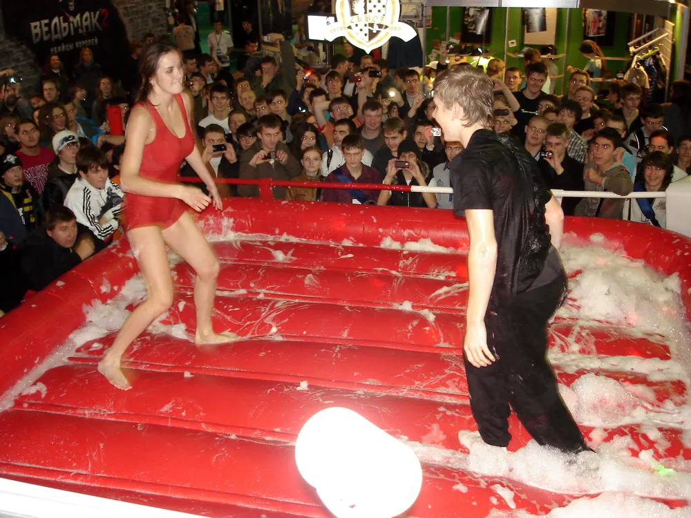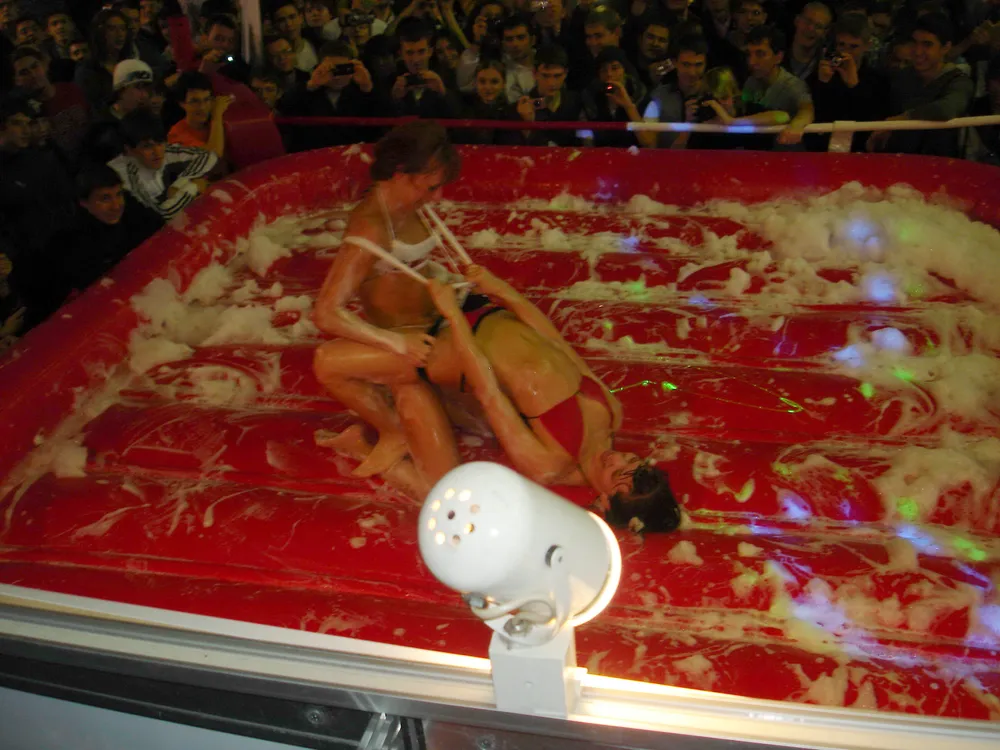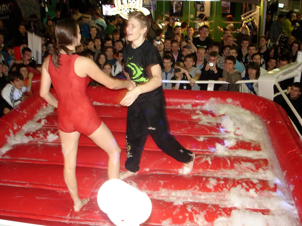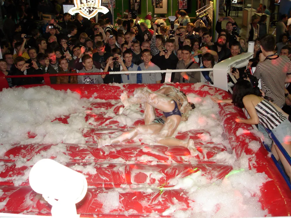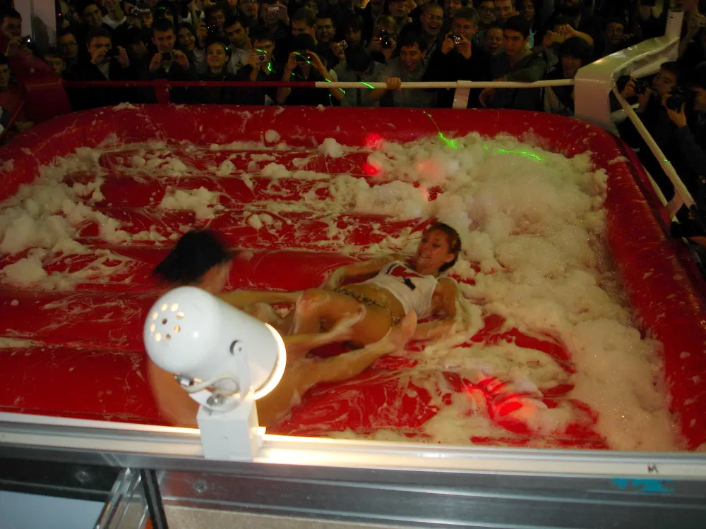 Сперва был рестлинг в пене. Не даром ведущий предупреждал зрителей отойти подальше, чтобы не получить "пяткой в глаз". В результате одного приёма участница чуть не вылетела за пределы ринга :)