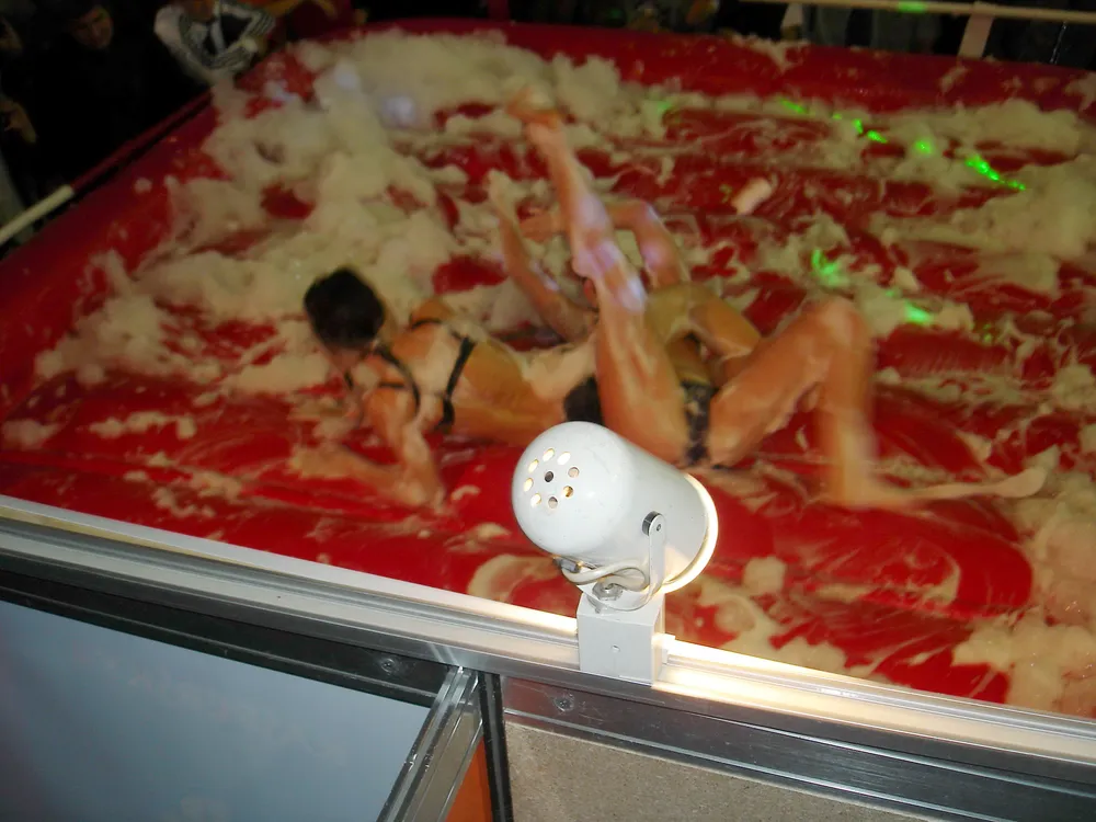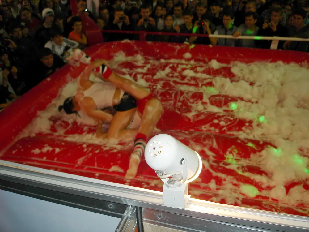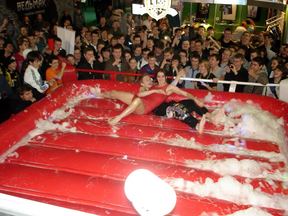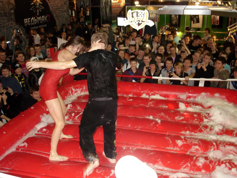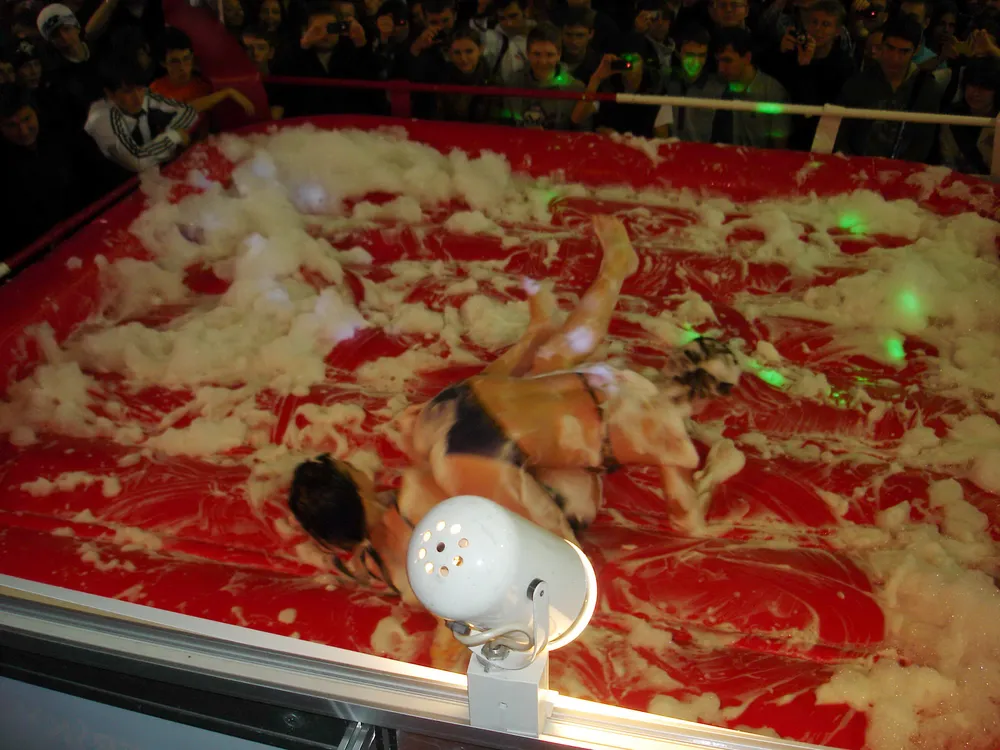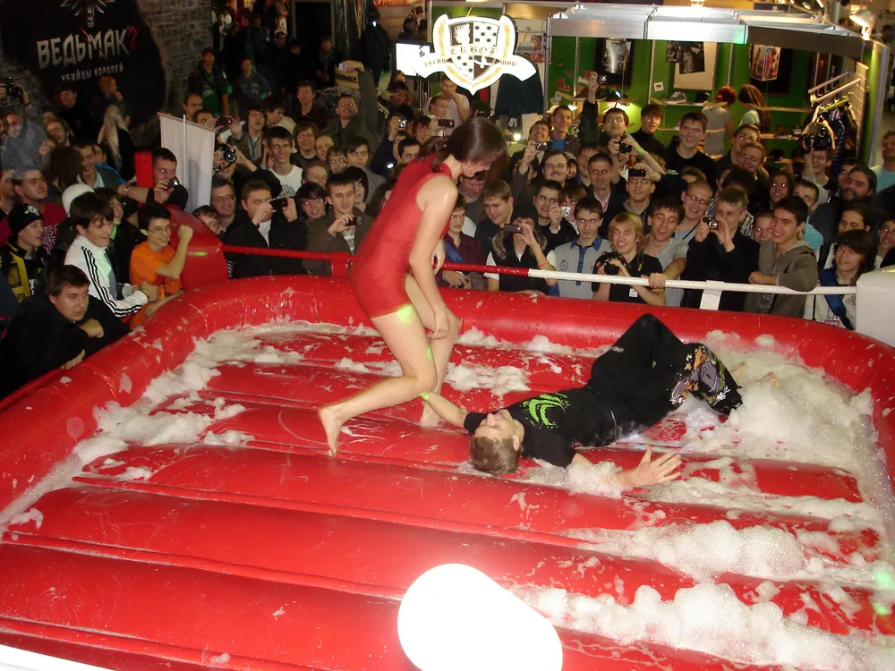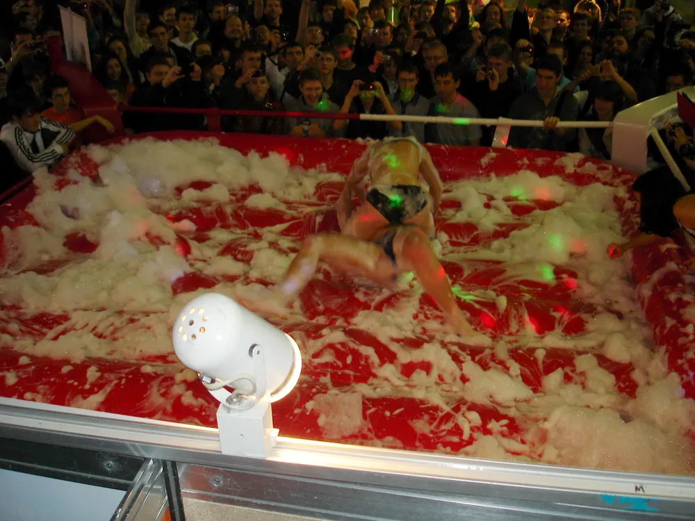 Сперва был рестлинг в пене. Не даром ведущий предупреждал зрителей отойти подальше, чтобы не получить "пяткой в глаз". В результате одного приёма участница чуть не вылетела за пределы ринга :)