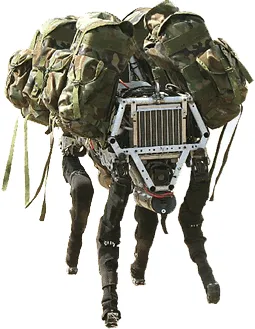 BigDog оснащен бензиновым двигателем, передвигается с помощью специальной гидравлической системой, построенной по аналогии с анатомией конечностей у животных.
