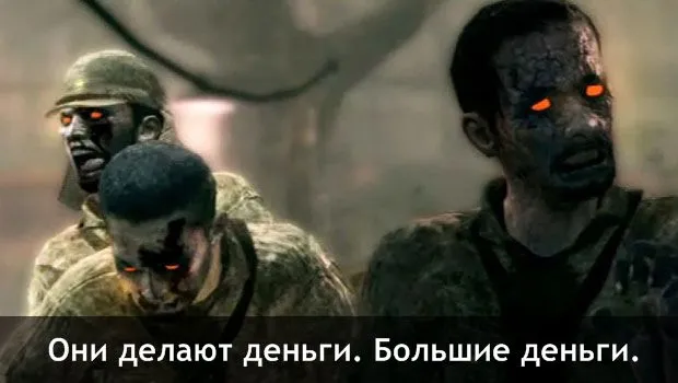 Мы играем, а они делают деньги. Всё просто. Несмотря на экономические, банковские и даже кризисы средних лет у Activison делат идут весьма неплохо. Еще со времён Call of Duty 4 они поняли, что на простых картах, которые еще пару лет назад фанаты делали бесплатно ради идеи, можно заработать пару десятков миллионов долларов, а они, как вы понимаете, лишними не бывают. Уже больше четырёх миллионов золотовалютных владельцев Xbox 360 и Playstaion 3 купили себе парочку новых карт, входяших в Map Pack и Map Pack 2. Вот дураки да? Всего-лишь месяц подождать и на PC они будут бесплатно, ведь мы то не дураки, верно?