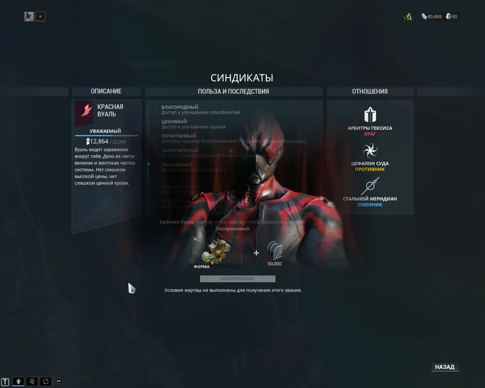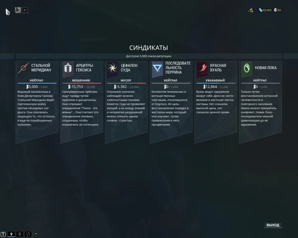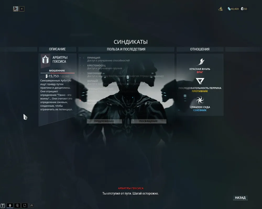 С моего первого появления на орбитере в углу капитанского мостика я заприметил одну консоль, куда сыпались уведомления от синдикатов. Бегло прочитав досье рекрутеров, я сразу же отмел тех, к кому я не примкну ни за какие коврижки. Ими оказались Арбитры Гексиса и Цефалон Суда. Первый синдикат, по всей видимости, состоял из тэнно, которые с какого-то перепуга решили, что их несправедливо обидели, ограничив конкретными задачами и натыкав кучу правил. Возможно, справедливые соображения, однако побеседуй они с Лотосом, думаю, многие «аргументы» отпали бы сами по себе. В сухом же остатке имеем зародыш тоталитарного, возможно даже деспотичного, режима с имперскими замашками, который действует по принципу «У кого дубина крепче, тот и прав». Косвенно мою теорию подтверждает отряд ликвидаторов под названием Порабощенные Стрелки… Да и потом, видал я одного парня, который возомнил из себя крутого и напал на учителя со словами «Ты недооцениваешь мою мощь!» А через несколько минут у него уже не было рук и ног. Правда, это не помешало ему потом стать знаменитым и хорошенько всыпать всем, кого он повстречает, но это уже другая история… И, кажется, вымышленная.