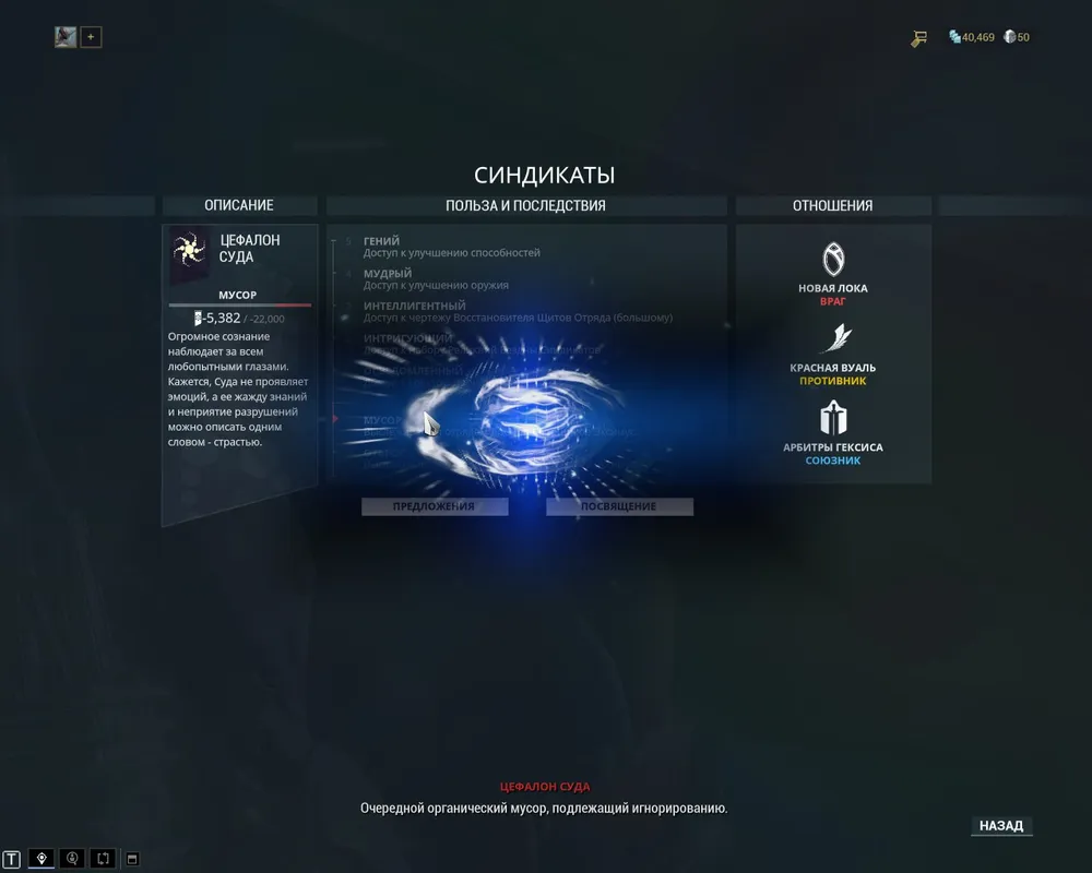 Но вернемся к нашим синдикатам. Цефалон Суда меня не устраивал по одной простой причине: это был обезличенный искусственный интеллект, ведь абсолютно все цефалоны созданы кем-то. Отсюда возникает логичный вопрос: кто хозяин этого цефалона? Цефалона с весьма приятным женским голосом... Словом, решать эти тайны синдикатского двора у меня не было желания, поэтому в дальнейшем я пытался понять, как примкнуть к одному из оставшихся синдикатов, тем более что их адептам полагались уж очень аппетитные презенты. Кавалерийским наскоком вопрос решить не удалось, а потому я отправился выполнять поручения Лотоса.