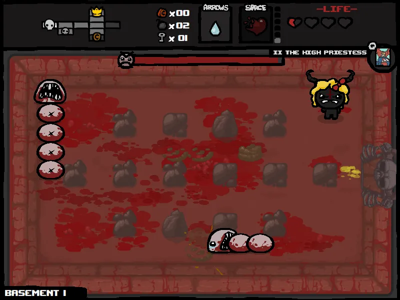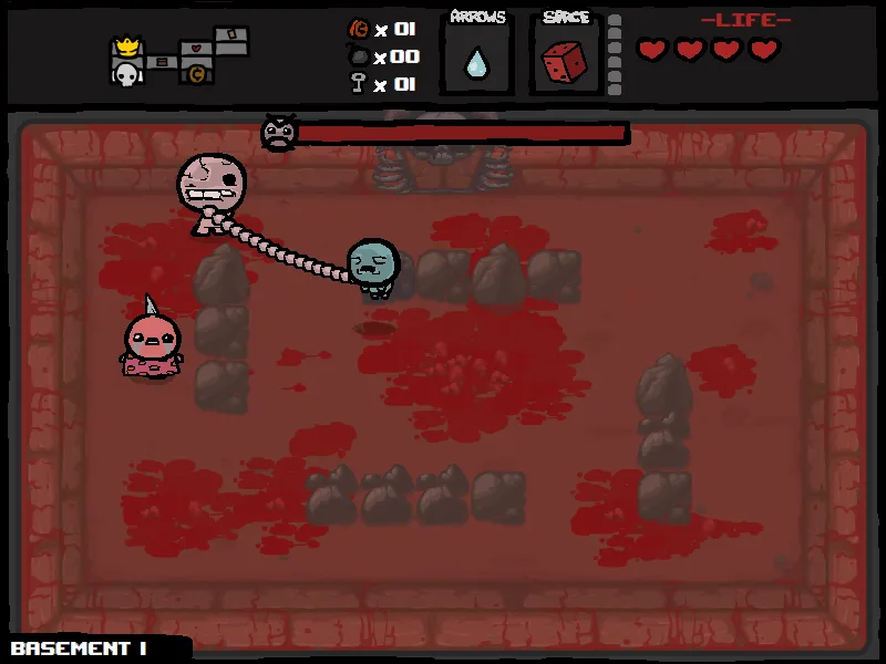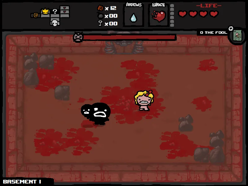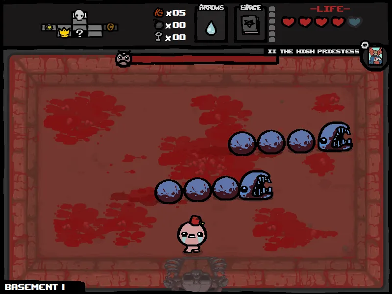Босс имеет очень высокую скорость и без усилений, по прямой не убежать. За персонажем не ползет, направление движения меняет рандомно. Передвигаясь, оставляет за собой кал, из которого можно выбить сердечко.