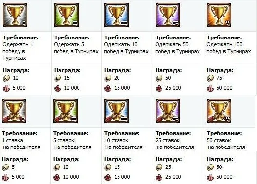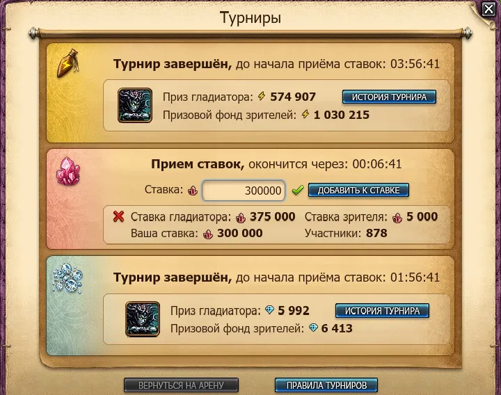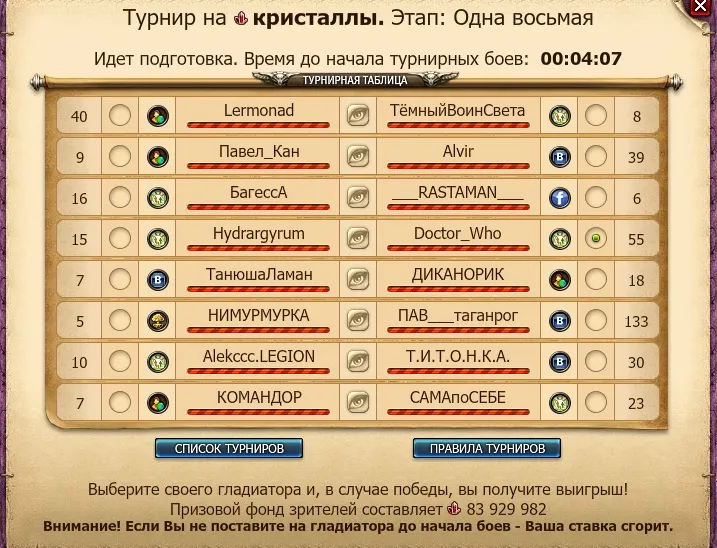Другое дело турнир!!! Все равны!! У каждого по 150 хп, 0 урона, брони, ярости, удачи, блока. Заклинания - только стандартные (без культовых), и то 1 уровня. Тут идут бои на вылет. 1\8, 1\4, полуфинал, финал. Естественно в финале встречается последняя пара гладиаторов.