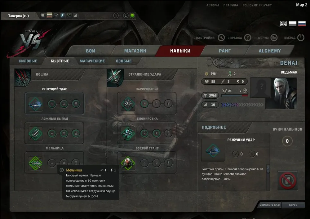 Бой протекает сам. По порядку вызываются одна атакующая и одна защитная способности соперников. Если угадали с последовательностью, то вам хорошо, если нет, то вас запросто порежут=)