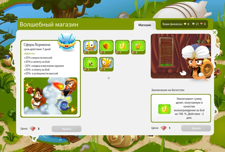 «Магазин одежды», где можно выбрать одеяние из широкого ассортимента, и повысить боевые параметры персонажа;