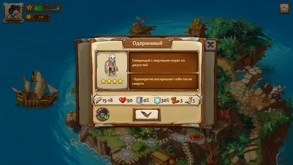 Пират постоянно находится в пьяном виде и еле передвигается. Как воин актуален на первых двух островах, после чего навечно отправляется в трюм, гонять крыс. Примечание: его спецспособность «Дьявольский огонь» поджигает цели и поможет выиграть бой с первым боссом, но пиратов в отряде должно быть не менее пяти.