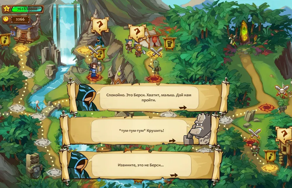 Иногда первое впечатление об игре бывает обманчивым: увидев «картинку» Braveland Pirate, я решил, что игра для детей, и запустил её на тяжёлом уровне сложности. Первая локация – ну точно, детская игра. Вторая локация; первый бой: ого! Не такая уж и детская! Второй, третий бой – совсем не детская! Словом, пройти вторую локацию я так и не смог: золота, необходимого для пополнения войска, не было, а победить «босса» имеющими силами не удавалось.