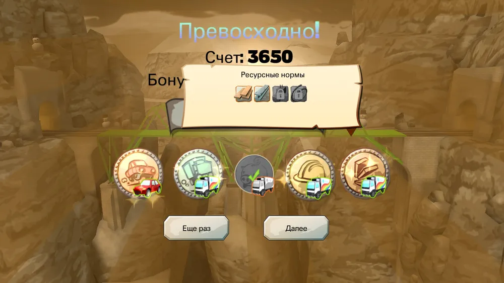 Зато для каждого моста здесь создали набор из пяти медалей: выдерживает автомобиль, выдерживает грузовик, экономичный мост, надежный мост и мост из определенных ресурсов.