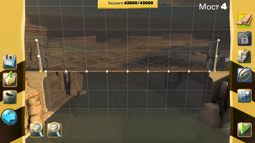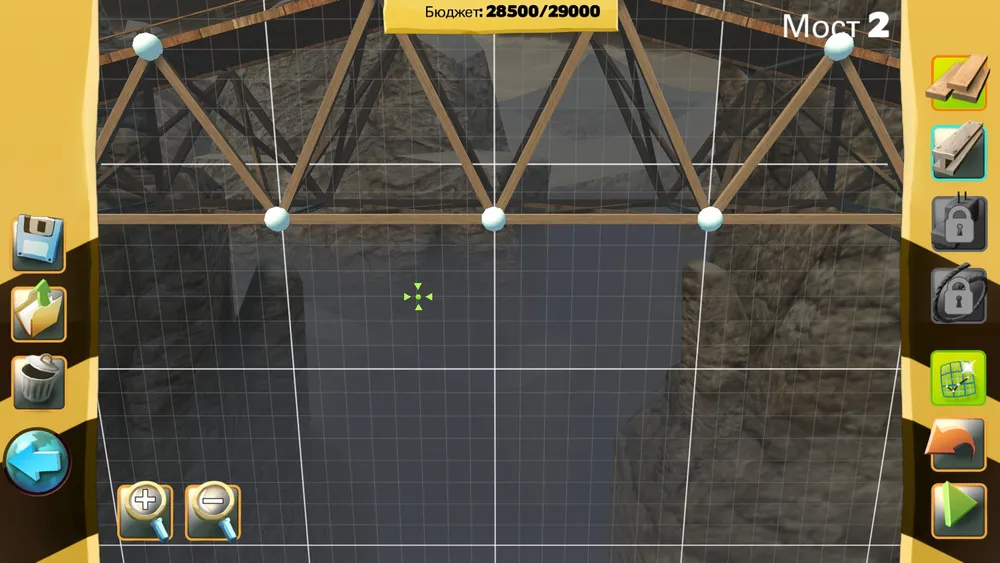 Для создания прочного моста нужно не банальное использование крепких материалов, а расположение деталей по знакомым из школьного курса физики правилам векторов силы. Например, чем больше плечо силы — тем меньше потребуется приложить усилий, чтобы сдвинуть с места камень при помощи рычага. Это правило пригодится в Bridge Constructor при создании высоких опор от которых будут протягиваться ванты для поддержания моста. Если опора будет недостаточно высокая (захочется сэкономить денег на материалах), то вантам не хватит силы удержать детали от давления на них тяжестью грузовика и дорога будет обрушаться. Это как один из примеров. Также полезно распределять нагрузку равномерно: двух свай может быть недостаточно, что поддержать центр моста. А если создать пучок из пяти свай и каждую соединить с центральными секциями моста, то тяжесть грузовика будет равномерно переходить на каждую опору и мост выдержит. Тут будет полезна ещё одна опция конструктора: включение мелкой сетки. С её помощью можно начать более точно выбирать постановку точек крепления деталей и делать, например, более плавные линии при создании арочных конструкций.