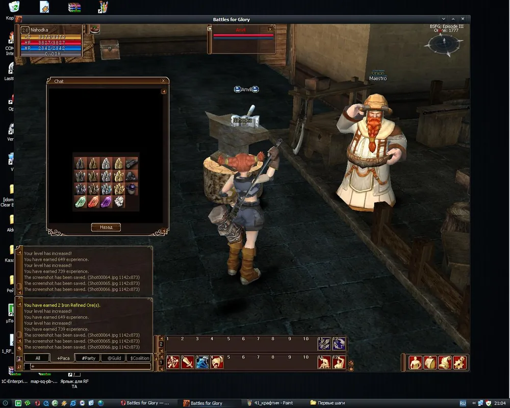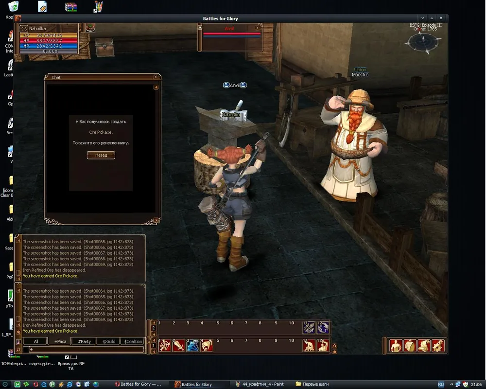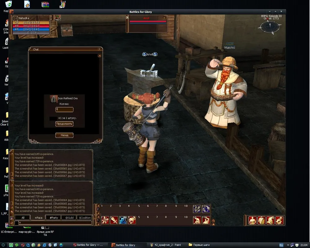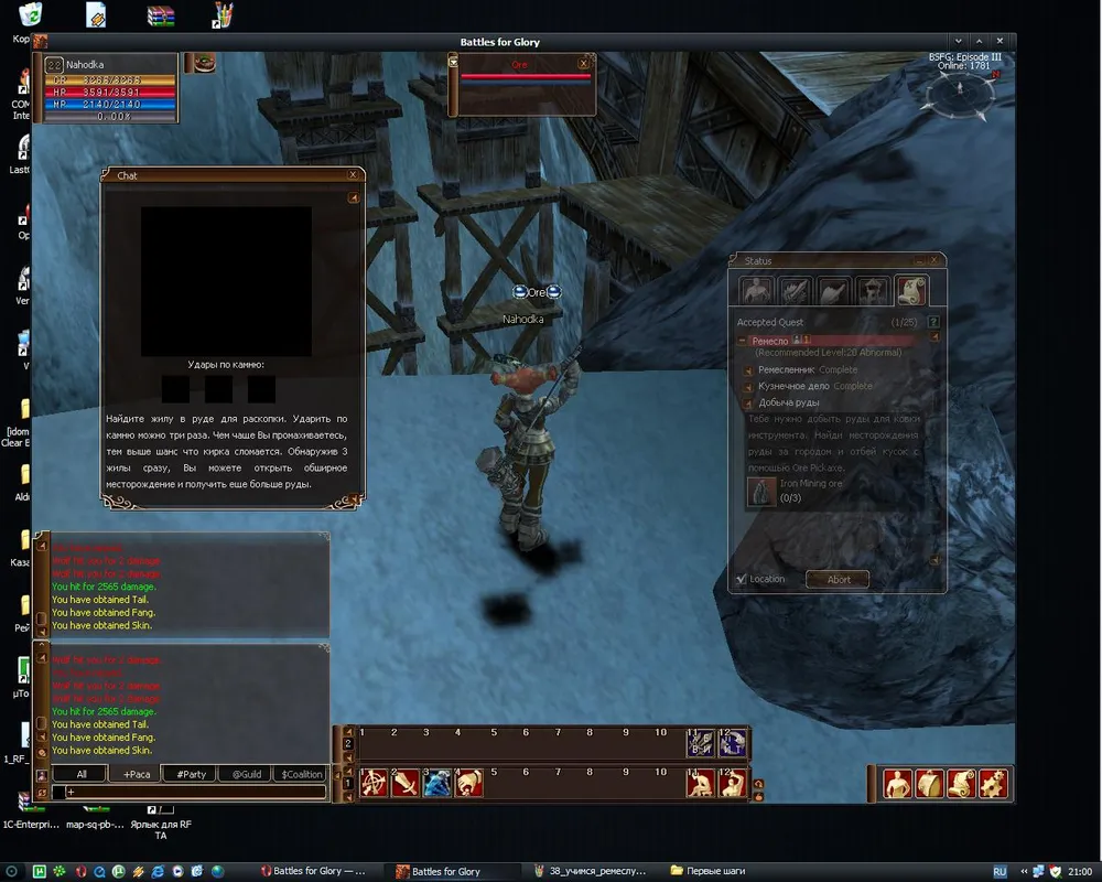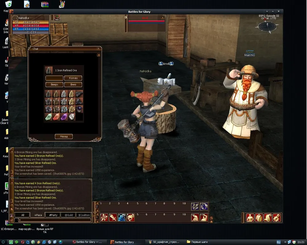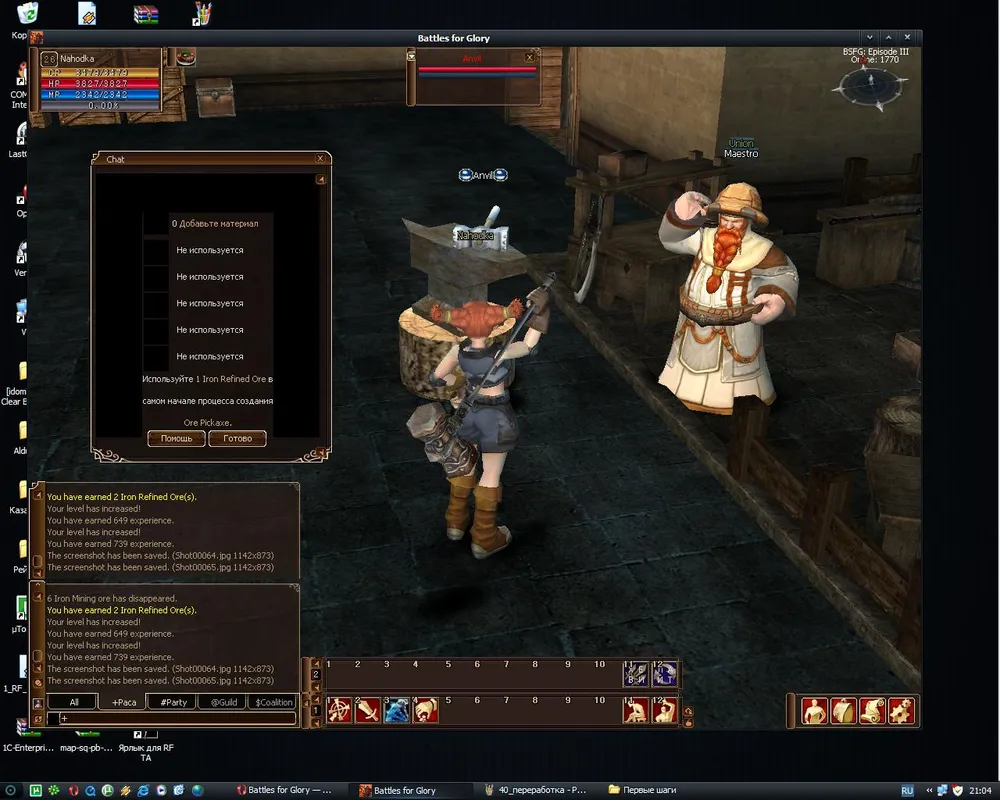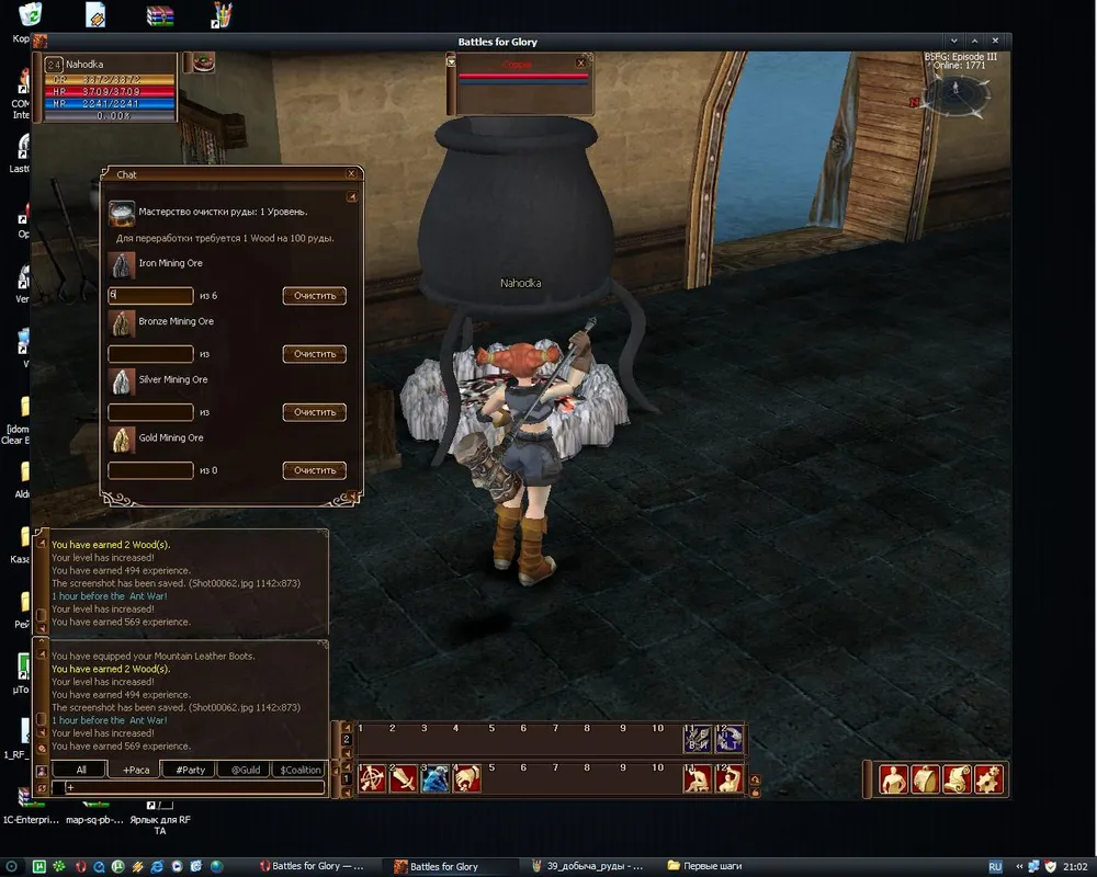 Обшарив окрестности и добыв 3 штуки железной руды (1 удачный удар) возвращаемся к Ремесленнику. Он научит вас перерабатывать руду. С ростом уровня умений добычи и переработки растет количество как добываемой руды, так и продуктов ее очистки.