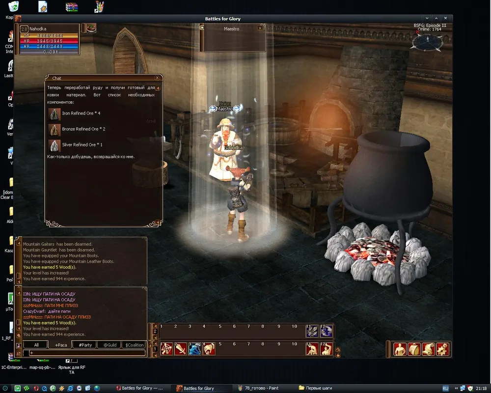 Теперь у нас есть немного очищеной руды. Самое время сделать из нее что-нибудь полезное. Мастер-Ремесленник научит вас основам Кузнечного Дела и милостиво разрешит воспользоватся его наковальней (в будущем вы будете пользоватся собственным инструментом - умения крафта имеют активную форму: самон наковальни или рабочего стола с личным меню крафта).