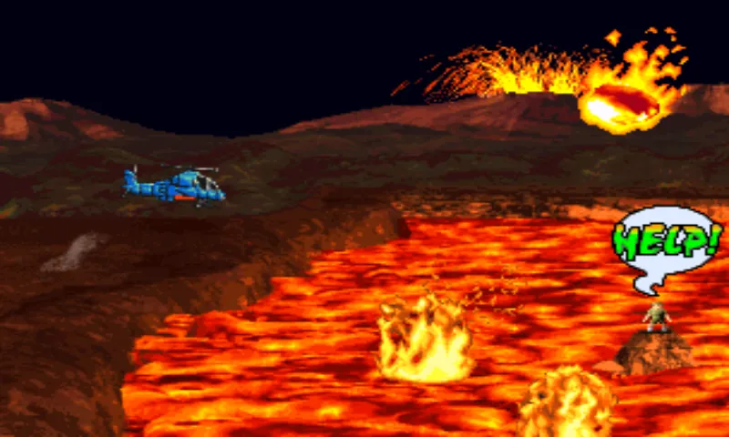 [B]Этап Пятый[/B]. Вулканы. Не бойтесь падающего с неба огня - он опасен только для динозавров. На этом уровне практически все динозары - стреляющие. Даже те, которые раньше просто пролетали мимо вас. На уровне нам снова встретится тиранозавр - чтобы его убить в этот раз, необходимо сбросить на него кусок скалы, висящей над ним. Так же нам придётся спасать людей с какого-то завода, или энергостанции (всех 30 человек). Чуть дальше будет очередной минибосс - четыре птеродактиля разных цветов. Красный стреляет розовыми сгустками энергии, которые можно сбить. Синий стреляет голубыми самонаводящимися шариками. Желтый стреляется огоньками, которые сбиваются. Зелёный стреляет голубыми шариками, которые так же можно сбить. Практически сразу же за птеродактилями нас ожидает босс этого уровня - тиранозавр. Он будет плеваться огнём разного вида, который можно сбивать и пускать огонь из хвоста (этот только избегать). После победы над тиранозавром нам покажут финального босса всей игры, который после пары десятков выстрелов сбежит от нас.