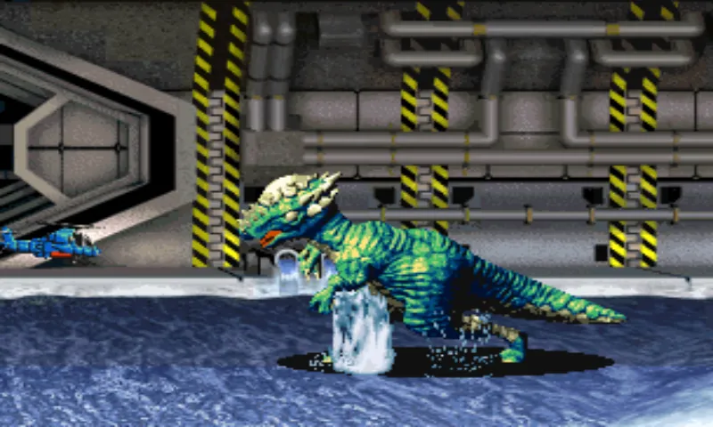 [B]Этап Первый[/B]. Город. В самом начале вы увидите тиранозавра с заставки, который будет крушить технику. Слава богу, здесь он представлен в виде фона и вы с ним никак не взаимодействуете. По ходу уровня вам встретится падающий дом, из которого надо будет подобрать людей, а после спуска под землю - авария в метро, после которой надо будет прикрывать эвакуацию выживших людей (всего 20). После успешной эвакуации вы получите кучу бонусов, в том числе и ракеты. Конечно, что выбирать - ваше дело, но я бы порекомендовал взять [B]H[/B] - самонаводящиеся, это очень облегчит жизнь в дальнейшем. Дальше по уровню мы спускаемся ещё глубже - в канализацию, где придется спасать ещё пару рыбаков. В конце концов вы догоните убегающего босса и начнётся бой. Босс скорее всего представляет собой кого-то из родственников [B]Пахицефалозавра[/B]. Изначально будет закидывать вас волнами звёздочек, через которые всегда можно пролететь. Потом будет прыгать, кидаясь концентрическими зелёными кругами и бегать, создавая такие же, по-видимому звуковые, круги.