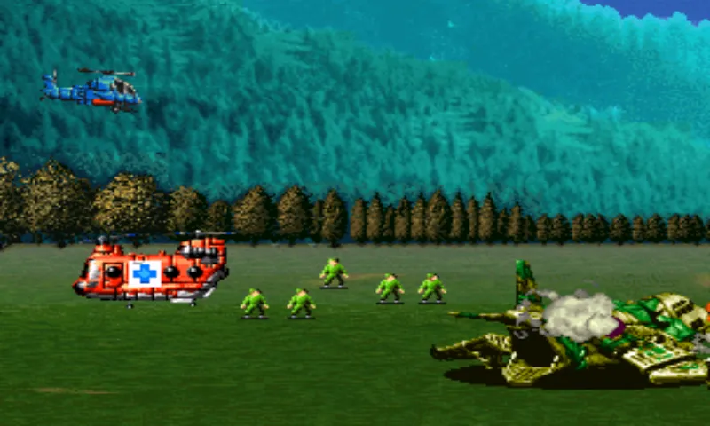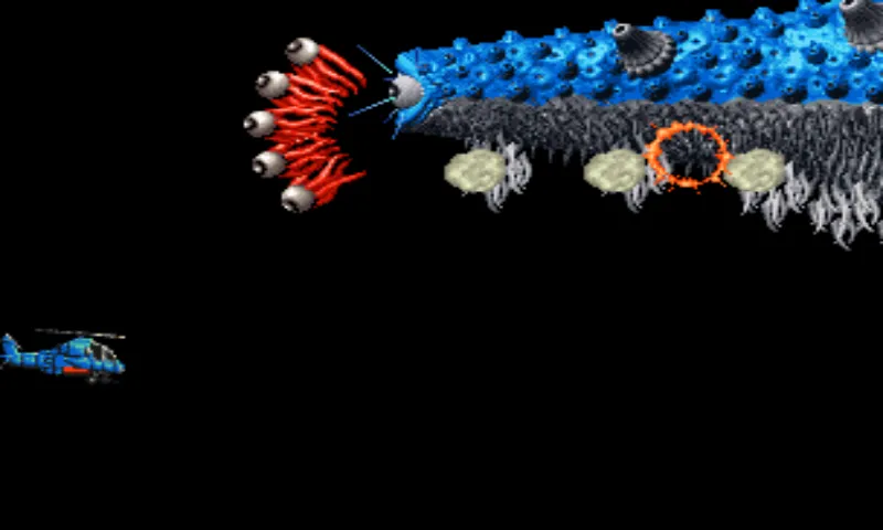 На этот раз здесь всё почти по стандарту. У нас есть обычное оружие - пулемёт, которое улучшается засчёт собираемых бонусов и есть супер-оружие, у которого всего 1-2 выстрела за жизнь (но есть бонусы, увеличивающие количество зарядов). Жаль, но огневая капсула, которая была внедрена в первой части игры, была забыта. И это сделало игру намного легче. Правда существует два режима стрельбы - если просто долбить по кнопке "огонь", то вы будете выпускать очередь за очередью по прямой, если же зажать кнопку "огонь", то с помощью джойстика можно будет одновременно управлять вертолётом и управлять направлением полёта патронов. Но большую часть игры вам всё-равно придётся пользоваться первым режимом стрельбы, ибо так привычнее. Помимо пулемёта и бомб, при подборе соответствующих бонусов вам выдадут ещё и ракеты. В итоге, когда наберёте много бонусов, от вертолёта во все стороны будут разлетаться смертоносные снаряды.