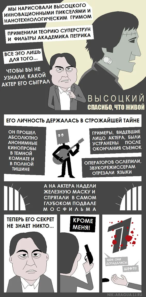 После выхода фильма "Высоцкий, спасибо, что живой" Валентин Гафт неожиданно сказал: "Умереть не страшно, страшно, что после смерти тебя сыграет Безруков".