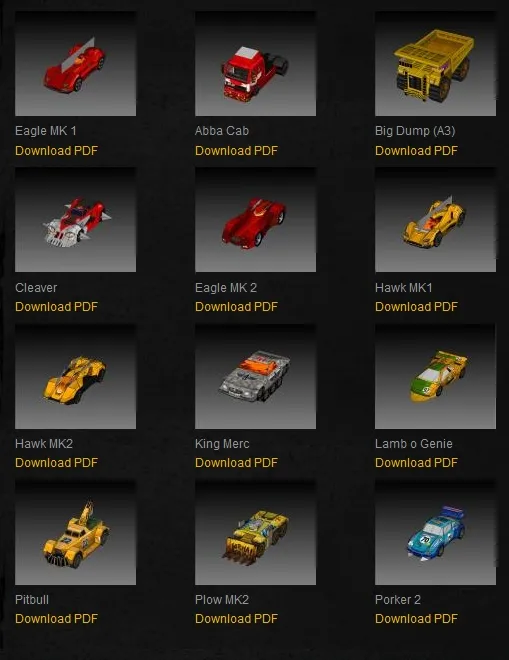 Все эти превосходные выкройки были созданы давним фанатов Кармы и отличным моделлером Harm'ом. С небольшой помощью программы Pepakura. эта сойти на позволяет "развернуть" любую трехмерную модель и превратить её в полноценную выкройку для создания бумажной модели. Harm взял классические машины из Carmageddon и превратил их в маленькие бумажные шедевры (в случае с Big Dump не такие уж маленькие).