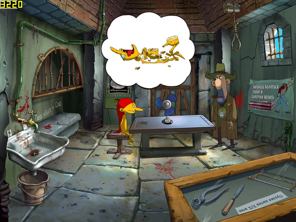 Под разъяренное настроение замечаешь еще один большой минус – отсутствие лошадиной дозы юмора. Он тут есть, но строго в быдловском дозиметре, т.е. однофразовый кэп. Весь потенциал абсурдности бытовых будней школоты, взгляда со стороны такого же двоечника, как и 99, 9% молодого населения страны, в том числе и бывшего, просто напросто не используется. Я не знаю чем вызвано не желание авторов делать Буратиллу более разговорчивым, добавить юмора, комментариев к нашим действиям(т.е. игрока, а не гг), вызванной извращенной логикой и виденьем использованием инвентаря.