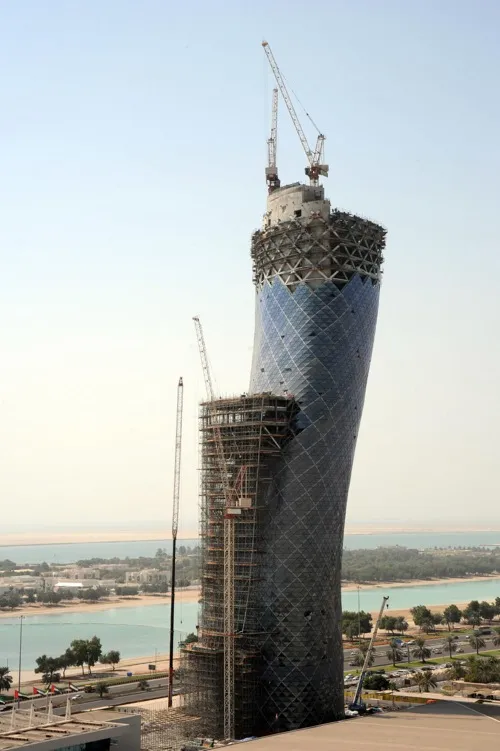 Владельцем и застройщиком многофункционального небоскреба Capital Gate является компания Abu Dhabi National Exhibitions Company, а проект принадлежит фирме RMJM. Башня Capital Gate названа так по своему месторасположению. Наклон Capital Gate Abu Dhabi в 4,5 раза дальше, чем у Падающей Пизанской башни в Италии. 35-этажное здание в Абу-Даби отклоняется от вертикальной оси на 18 градусов в западном направлении, а отдельно стоящая колокольня в Пизе только на четыре. Первые 12 этажей здания Capital Gate располагаются вертикально, строго один над другим. После чего, уровни здания располагаются ступенчато, с постепенным увеличением размера «ступеней» от 30 до 140 см, что и придало башне наклон. Проект Capital Gate Abu Dhabi включает в себя пятизвездочный отель Hyatt и около 20 тысяч квадратных метров офисных площадей премиум-класса.