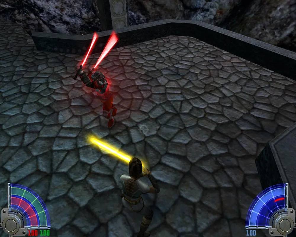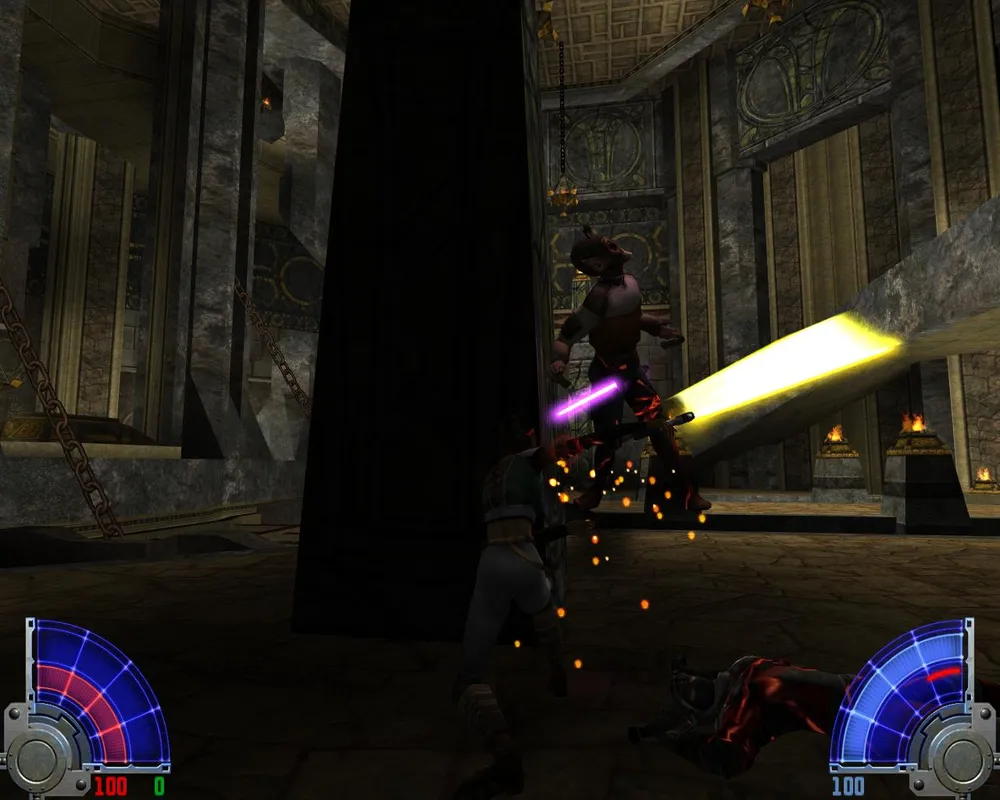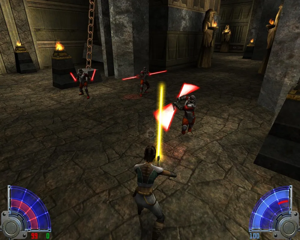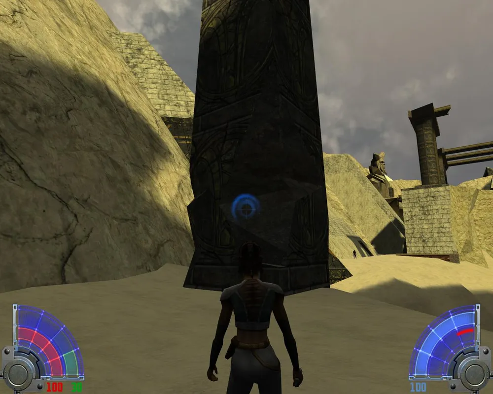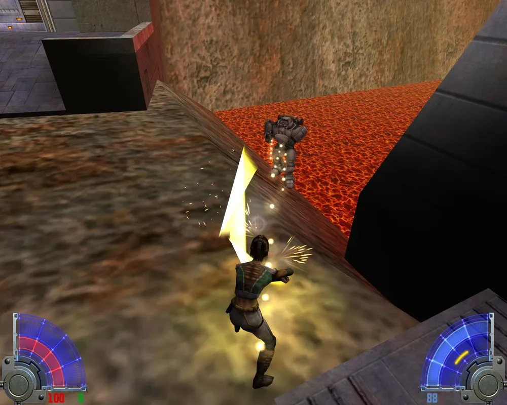 В комнате с лавой перебираемся на другую сторону. Убив трех темных джедаев в большом зале, уничтожаем две каменных палки, на которых держится плита. Открывается дверь в Долину.