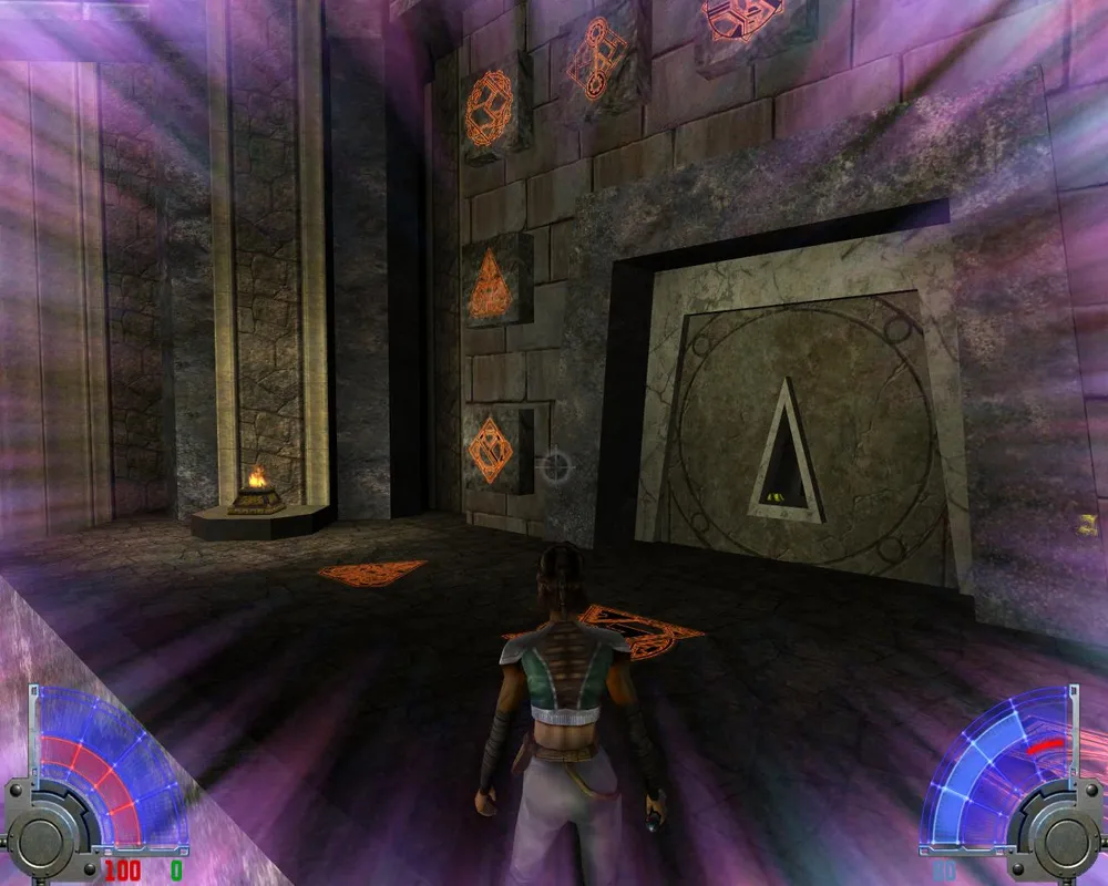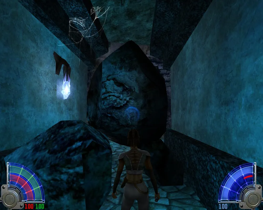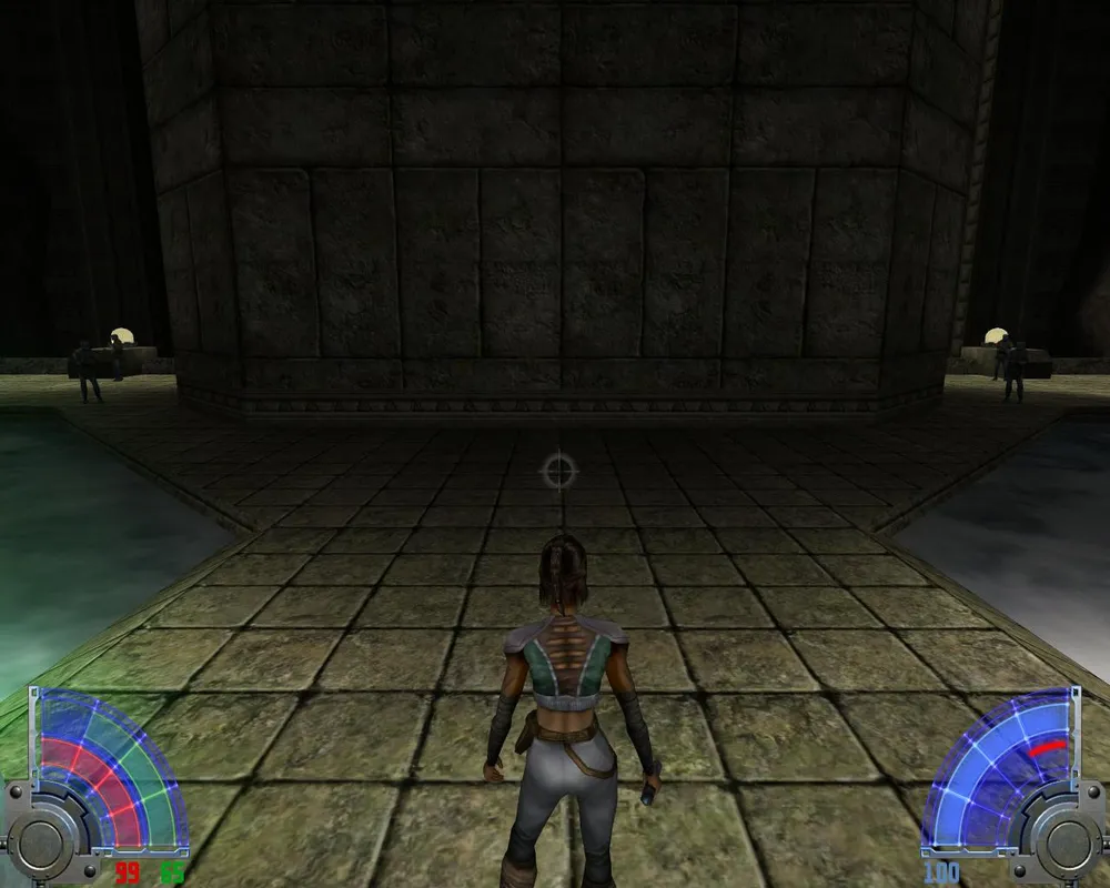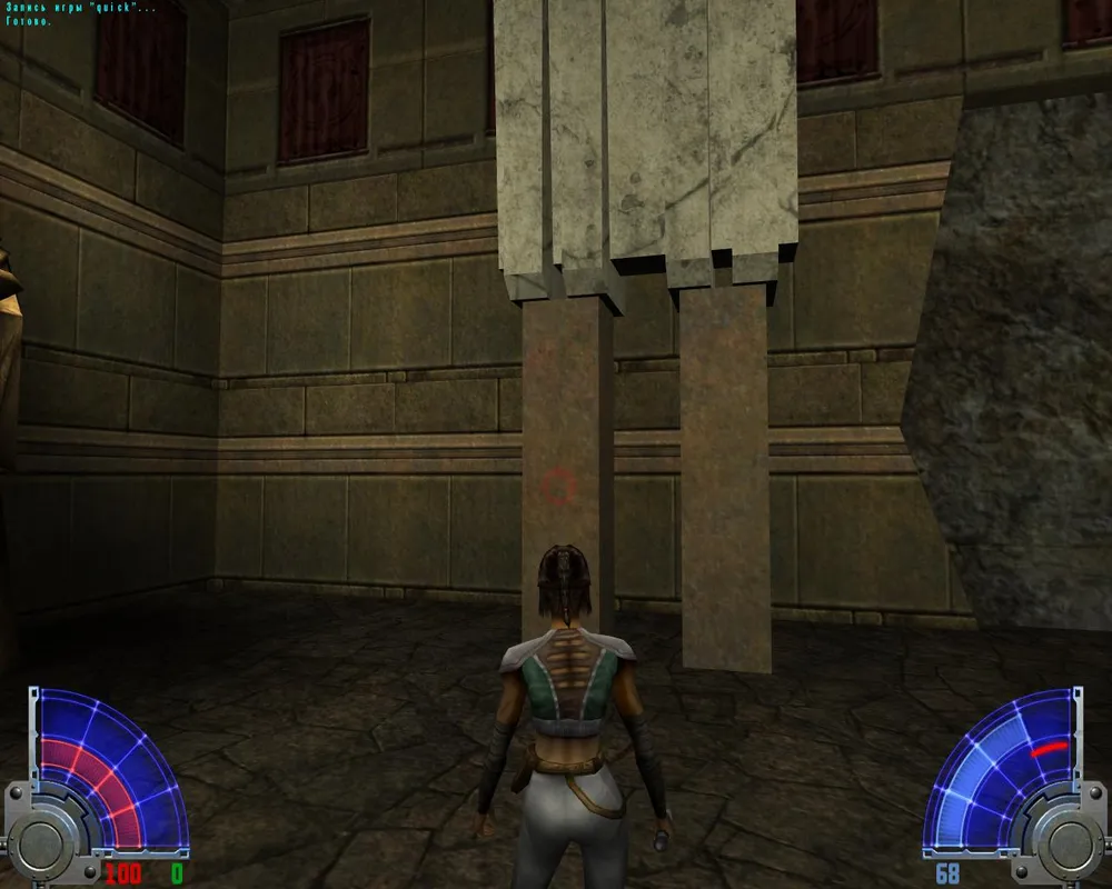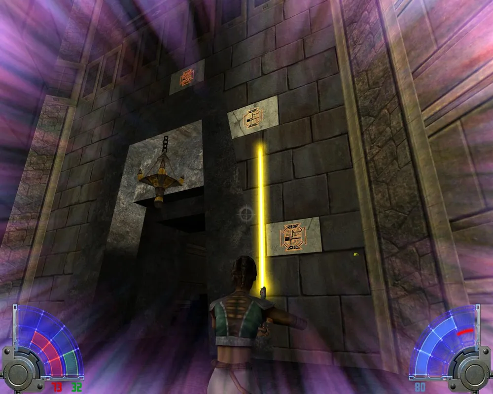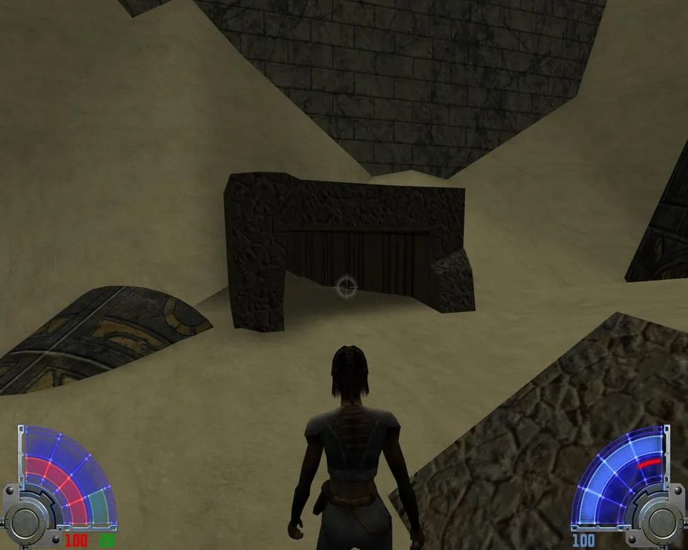В комнате с лавой перебираемся на другую сторону. Убив трех темных джедаев в большом зале, уничтожаем две каменных палки, на которых держится плита. Открывается дверь в Долину.