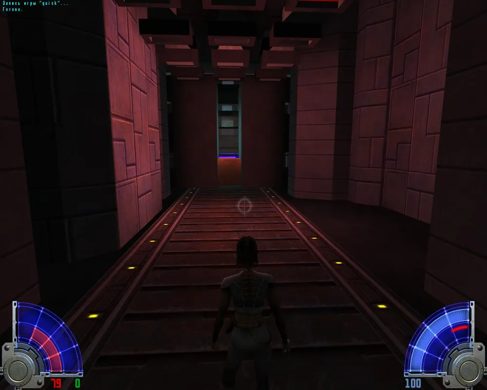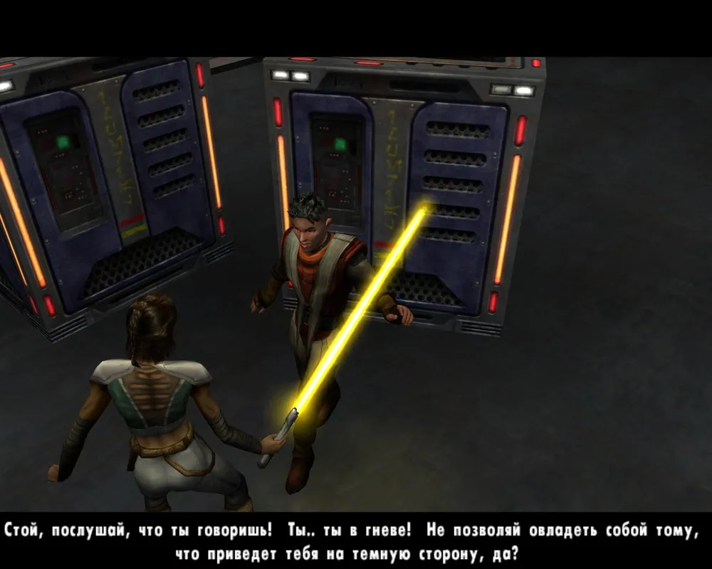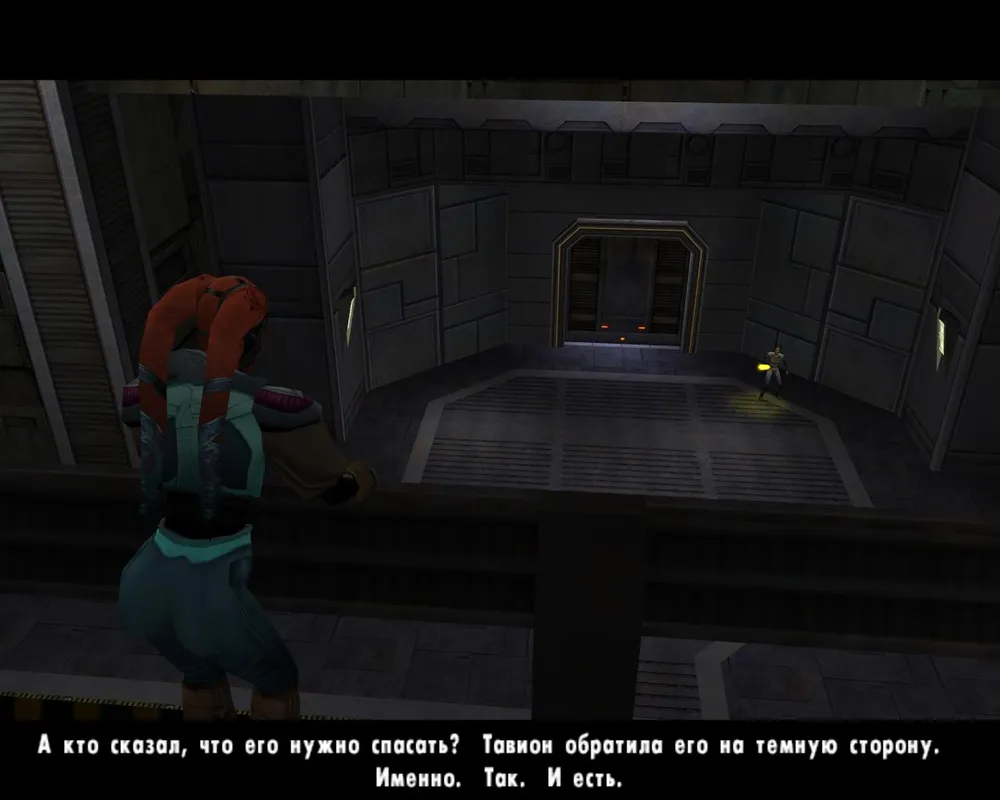 За вторым прессом находятся два силовых поля. Пройдя через первое поле быстро двигаемся вперед, пока нас не убило прессом. Ждем, когда отключится второе силовое поле, и так же быстро бежим вперед. Таким образом, мы добираемся до конца и заходим в дверь справа. В который раз нам встречается Алора. На этот раз она говорит: "Может быть, и ты научишься служить Тавион", - и выпускает на нас темного джедая. Как-то нелогично: мертвые никому не служат.
