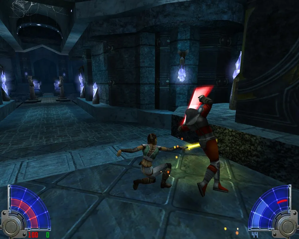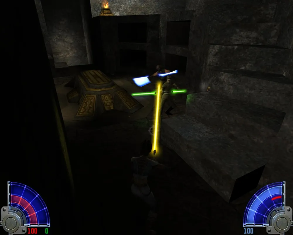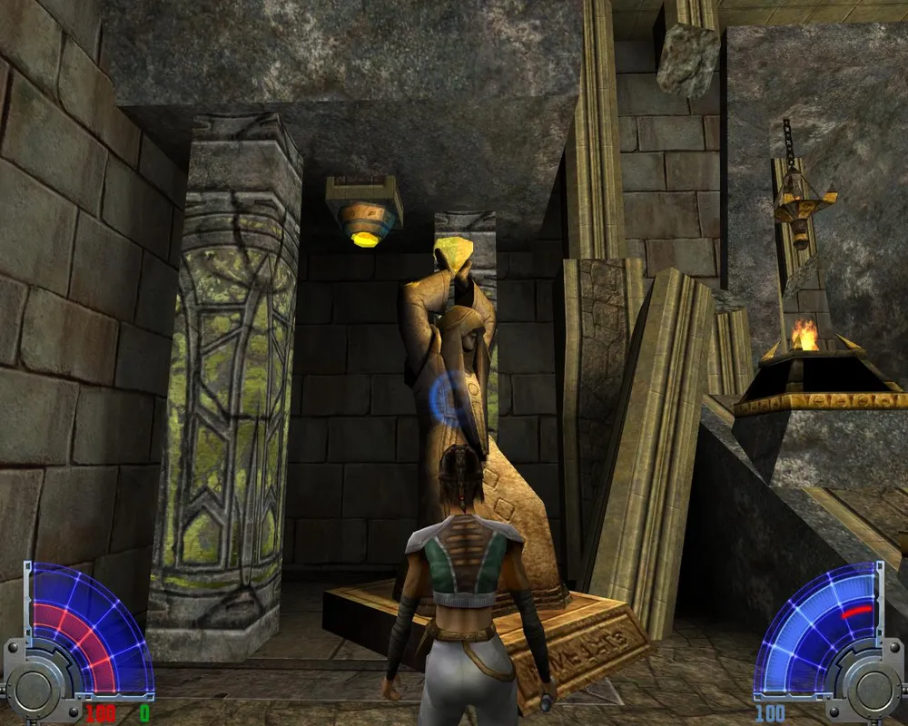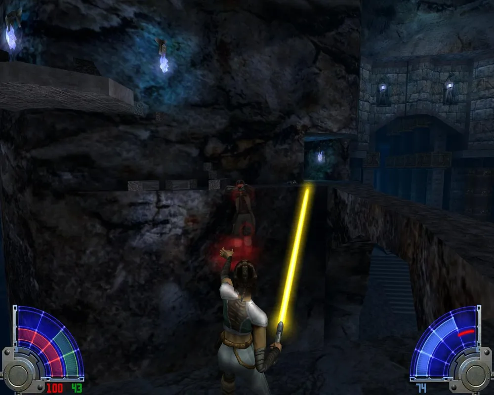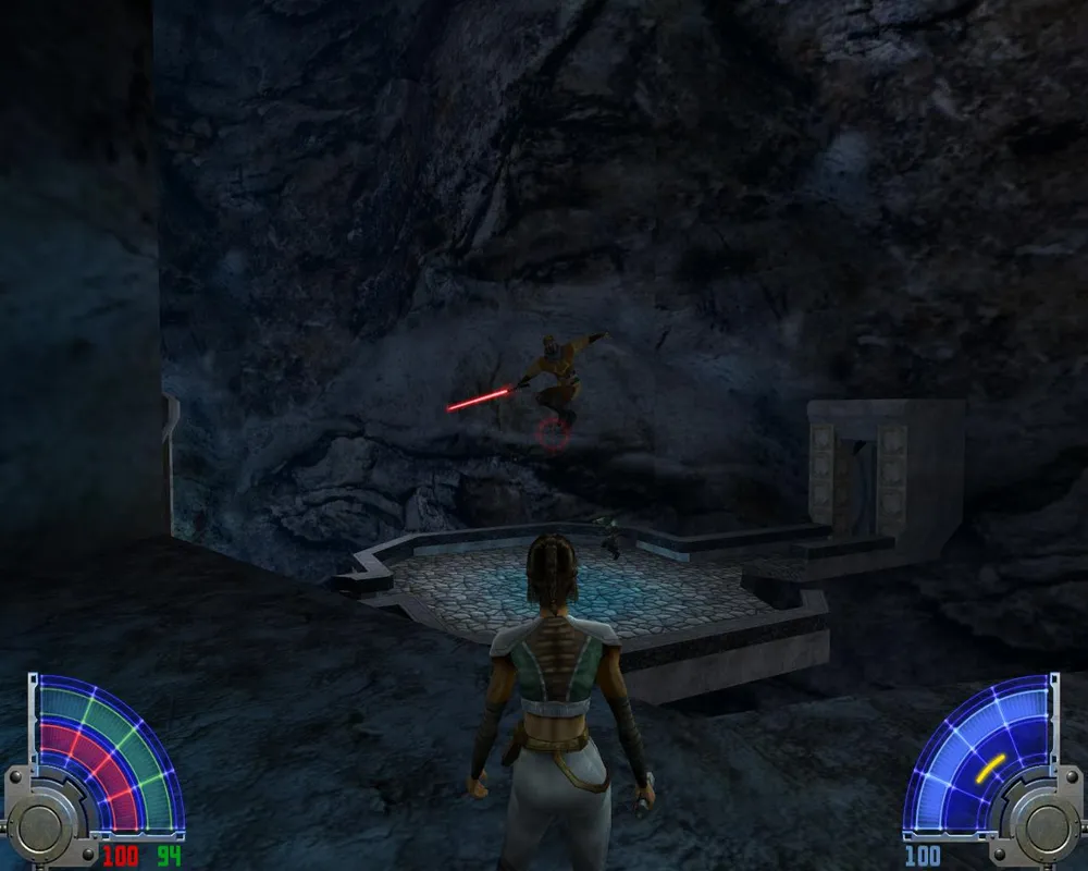 Так же Джейден заметит, что ей отсюда не спуститься, не сломав ног. Чтобы ноги не сломать спускаемся по мелким платформам, как по лестнице. Попав на широкий и светлый мост, идем по еще одному узкому выступу. Дойдя до места с двумя темными джедаями, убиваем их и лезем уже наверх, правда, недолго. Войдя в гробницу, сражаемся сначала с двумя темными джедаями с двойными мечами.