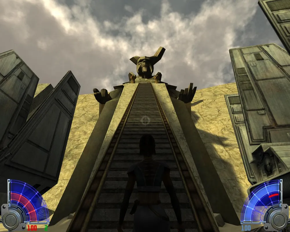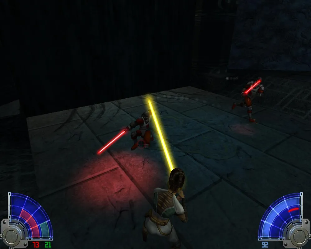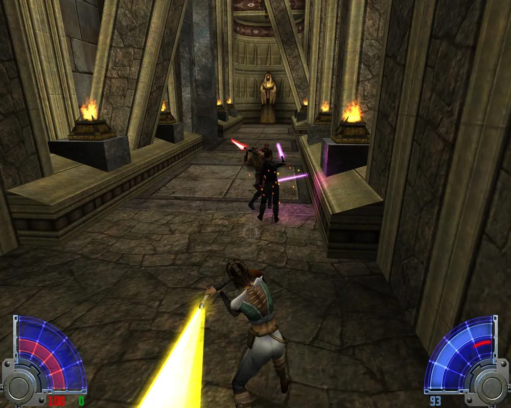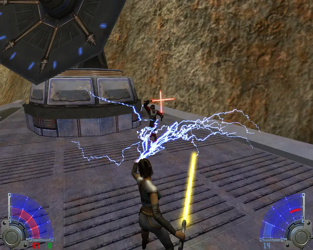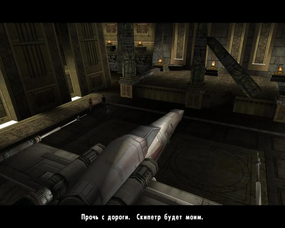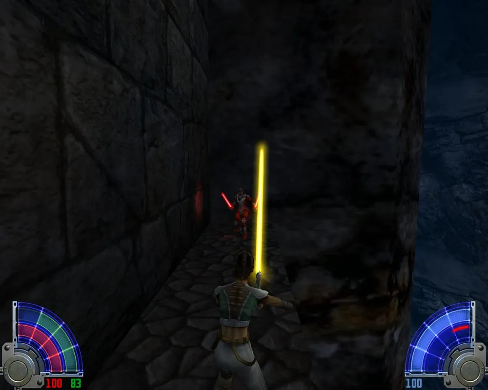 Так же Джейден заметит, что ей отсюда не спуститься, не сломав ног. Чтобы ноги не сломать спускаемся по мелким платформам, как по лестнице. Попав на широкий и светлый мост, идем по еще одному узкому выступу. Дойдя до места с двумя темными джедаями, убиваем их и лезем уже наверх, правда, недолго. Войдя в гробницу, сражаемся сначала с двумя темными джедаями с двойными мечами.