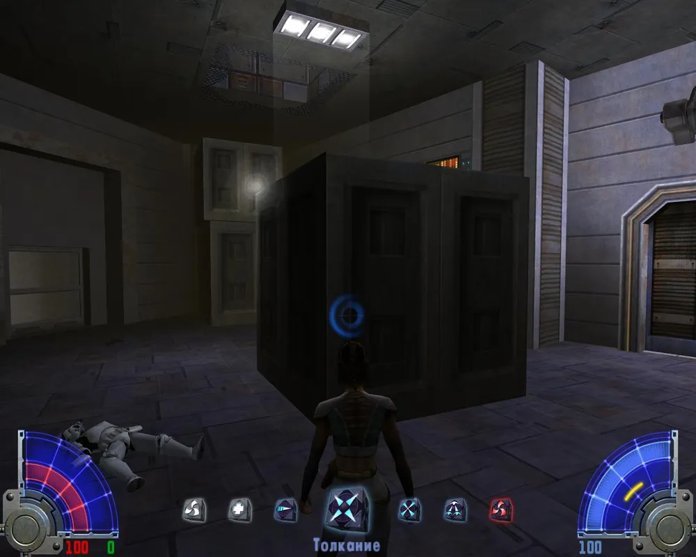 Перейдя через мост, сразимся с еще двумя темными джедаями и поднимаемся на лифте. В помещении, в котором мы оказались, есть одна дверь, ведущая к разрушенному мосту. Нам не туда. Находим ящик и применяем на нем Силу, чтобы сдвинуть.