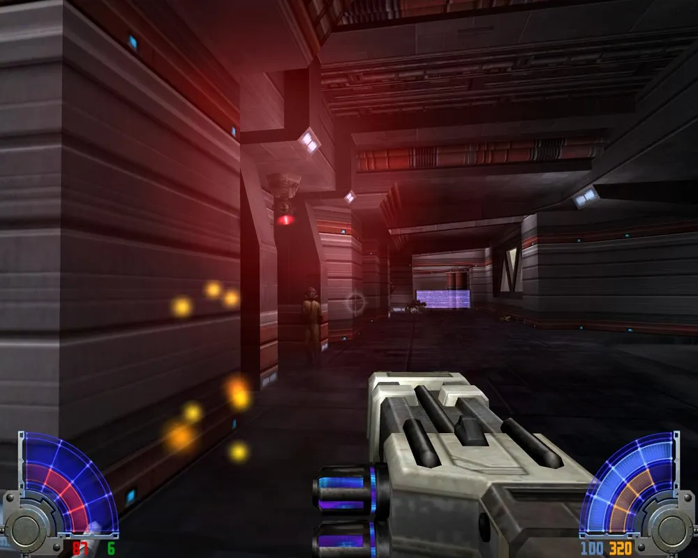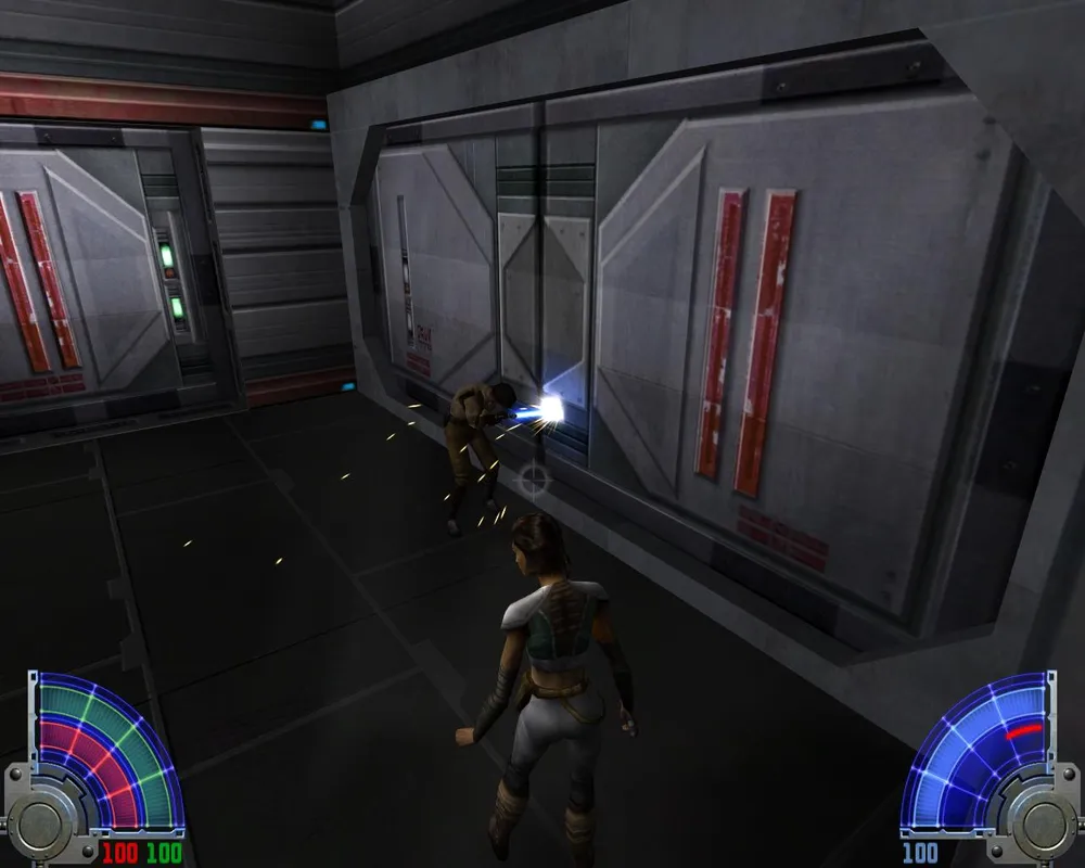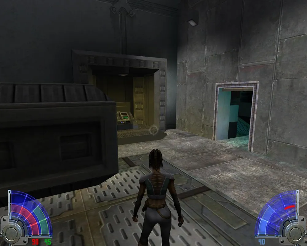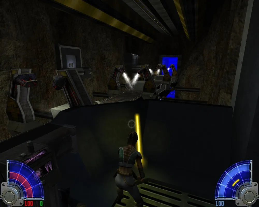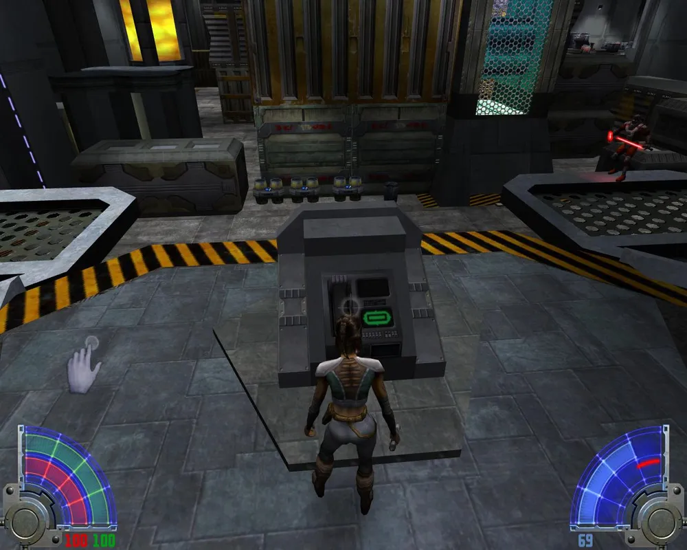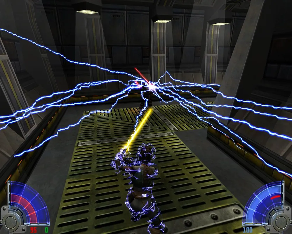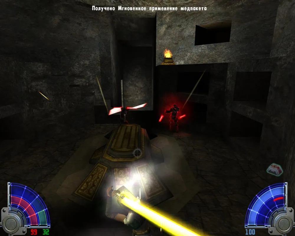 Убив их, переходим по левому краю через лаву и заходим в дверь. Идем прямо, убивая джедаев. Поднявшись на лифте, видим две двери: первая ведет к аптечке и щиту, для прохождения нужно идти во вторую. В следующем помещение видим уже три двери: первая ведет к темному джедаю и пополнению щита. Вторая ведет к аптечке. Нам нужна третья. За ней лифт, на котором мы поднимаемся еще выше.