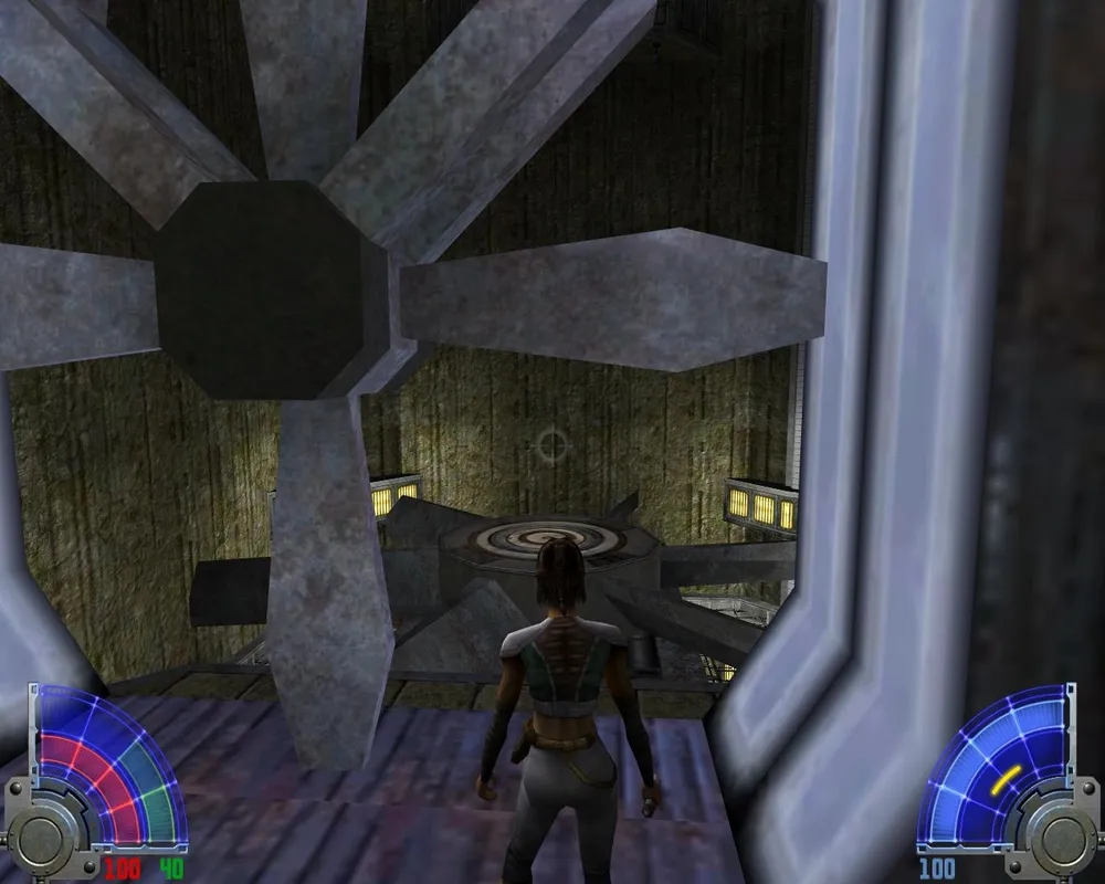 В центре находятся еще двое Яларианцев. Идем налево, зайдя в помещение, убиваем группу штурмовиков и едем на лифте вниз. Внизу дергаем рычаг и возвращаемся в первую комнату. Пролезаем через остановившийся вентилятор.