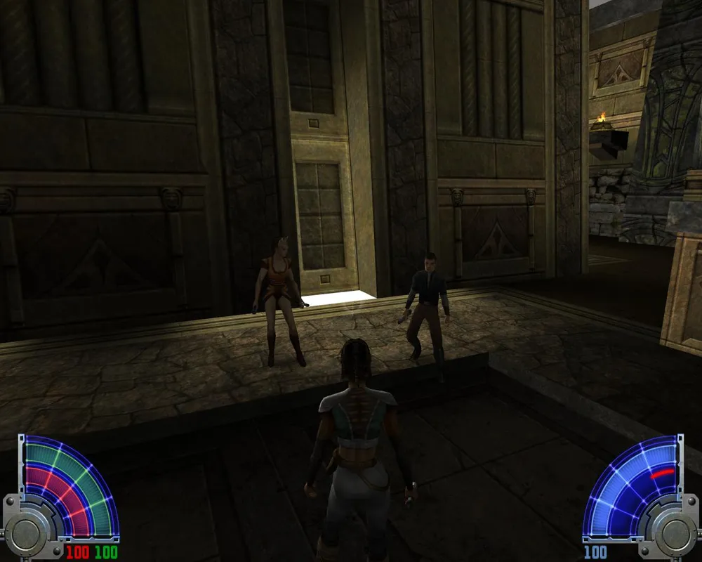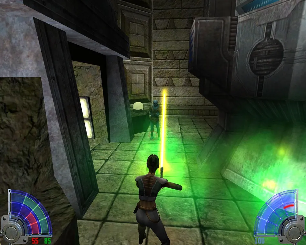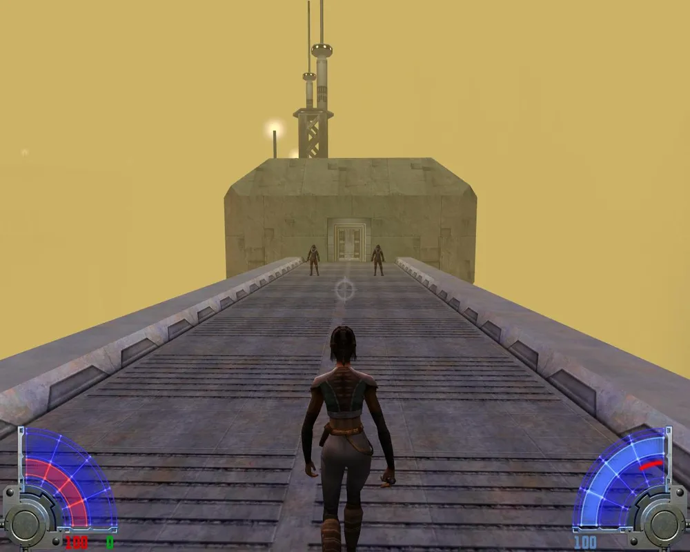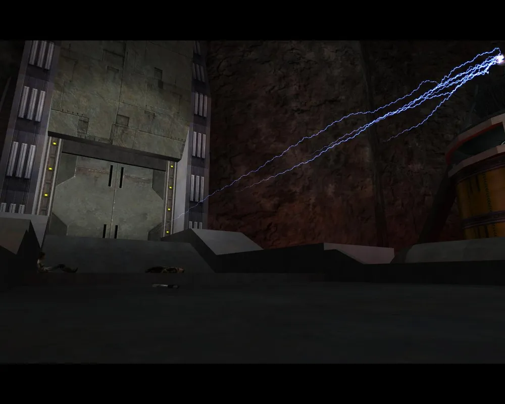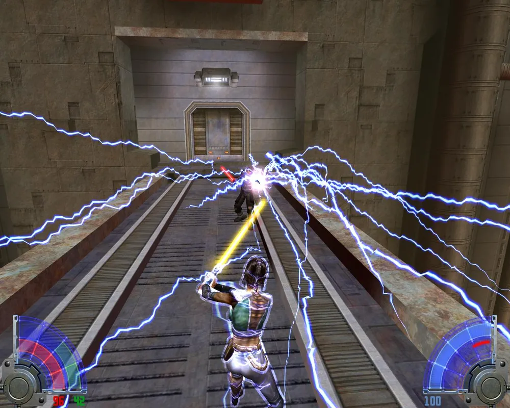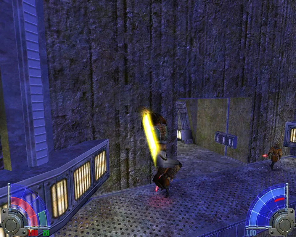 Убив его, мы не зайдем в дверь, потому что она закрыта. Поворачиваем налево, там виднеется рычаг. Дернув за него, мы выдвинем мост где-то очень высоко, так что нам надо до него добраться. Вернувшись в здание, где мы убили кучу имперцев, замечаем, что теперь открыта дверь лифта, и мы можем на нем проехаться наверх. Попав на второй этаж, выходим через дверь, ведущую к двум темным джедаям.