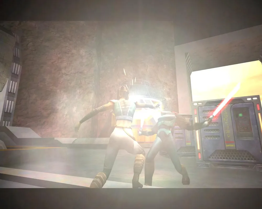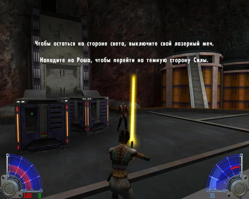 Там просто ждем, когда дверь откроется. Если вы так оторвались от Ранкора, что можете позволить себе такое. Можно даже побить темных джедаев. В следующем помещении находим рубильник и дергаем его.