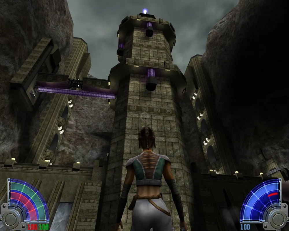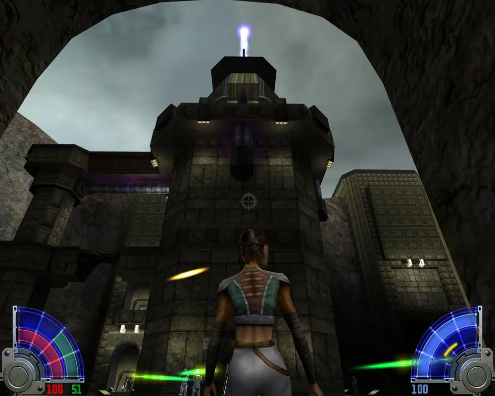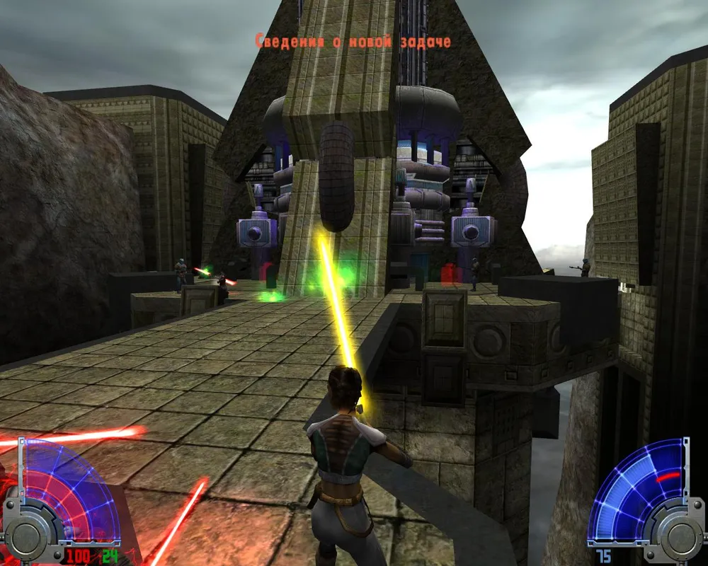 Заходим в башню и бежим по лестнице, вырезая темных джедаев. Добравшись до верха, убиваем джедаев и синих человечков, после чего садимся в лифт. Приехав, вновь натыкаемся на джедаев и Яларианцев, а так же видим места для закладки бомб.