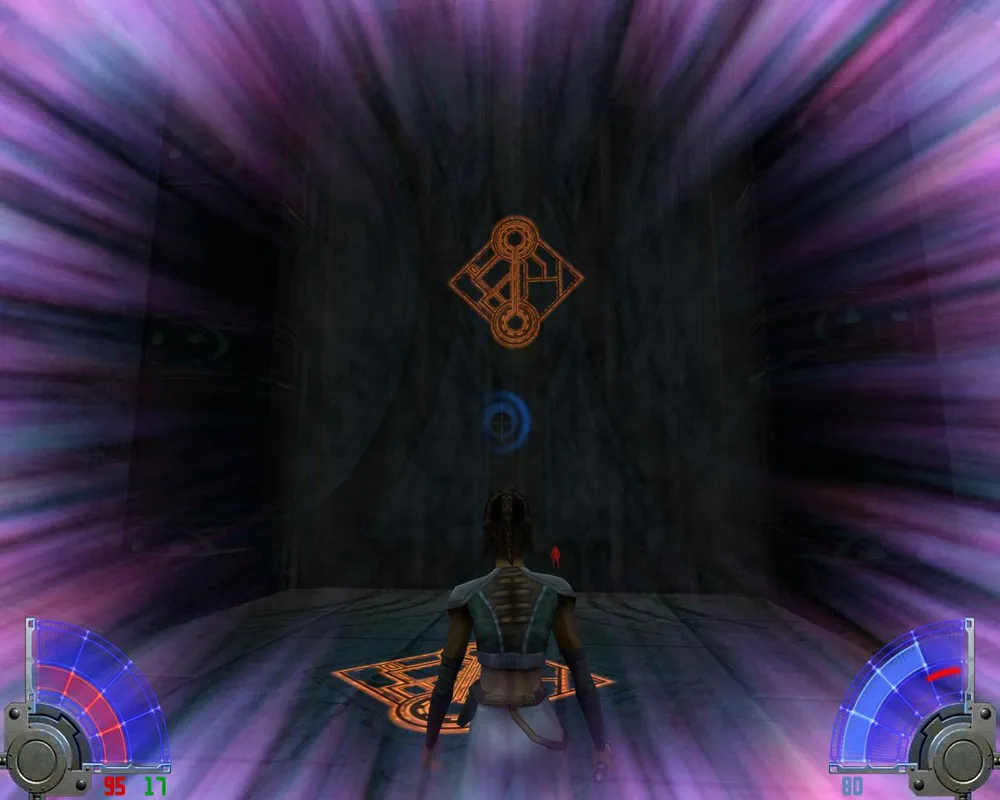 Не ясно, зачем знак на полу, но на дверь используем силу «Рывок». Пройдя через открывшиеся ворота, убиваем темного джедая с двумя мечами и за ним еще одного «синего». Перед нами пропасть. Слева видим врагов, а справа можно спуститься и найти секретную зону.