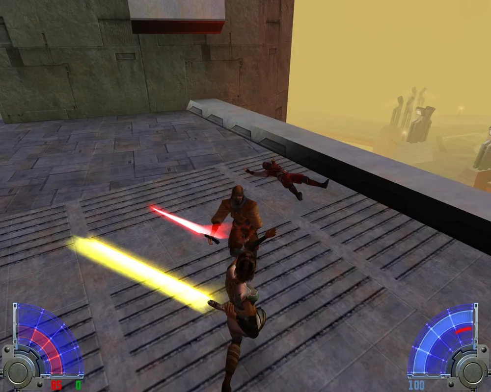 Сразившись с напавшим на нас темным джедаем с дуалами, идем направо. Хотя слово "идем" здесь не уместно, лучше сказать прыгаем. Убив наемников и пройдя чуть дальше, мы наткнемся на двух темных джедаев, прыгнувших на нас снизу.