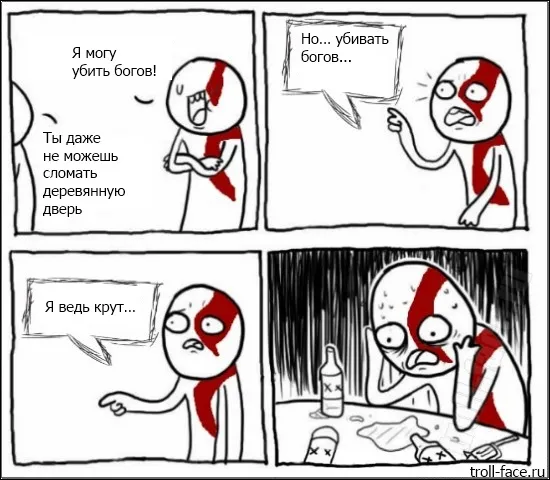ПЕТР, видимо, посмеялся своими микросхемами и тут же нашел какую подлянку мне устроить. Выражалась она в виде лысого мужика с красной татуировкой через лицо и тело. Он стоял прямо напротив меня, впившись в меня звериным взглядом. На руках его были цепи, что были сцеплены с его костями и поэтому вырастали прямо из-под кожи, а на их концах были изогнутые клинки, способные разрубить все на свете. В том числе и меня, бога войны Ареса, хорошего в целом парня, пусть и любителя пошалить. Видимо за этим (разрубить, не пошалить) Кратос и пришел ко мне.