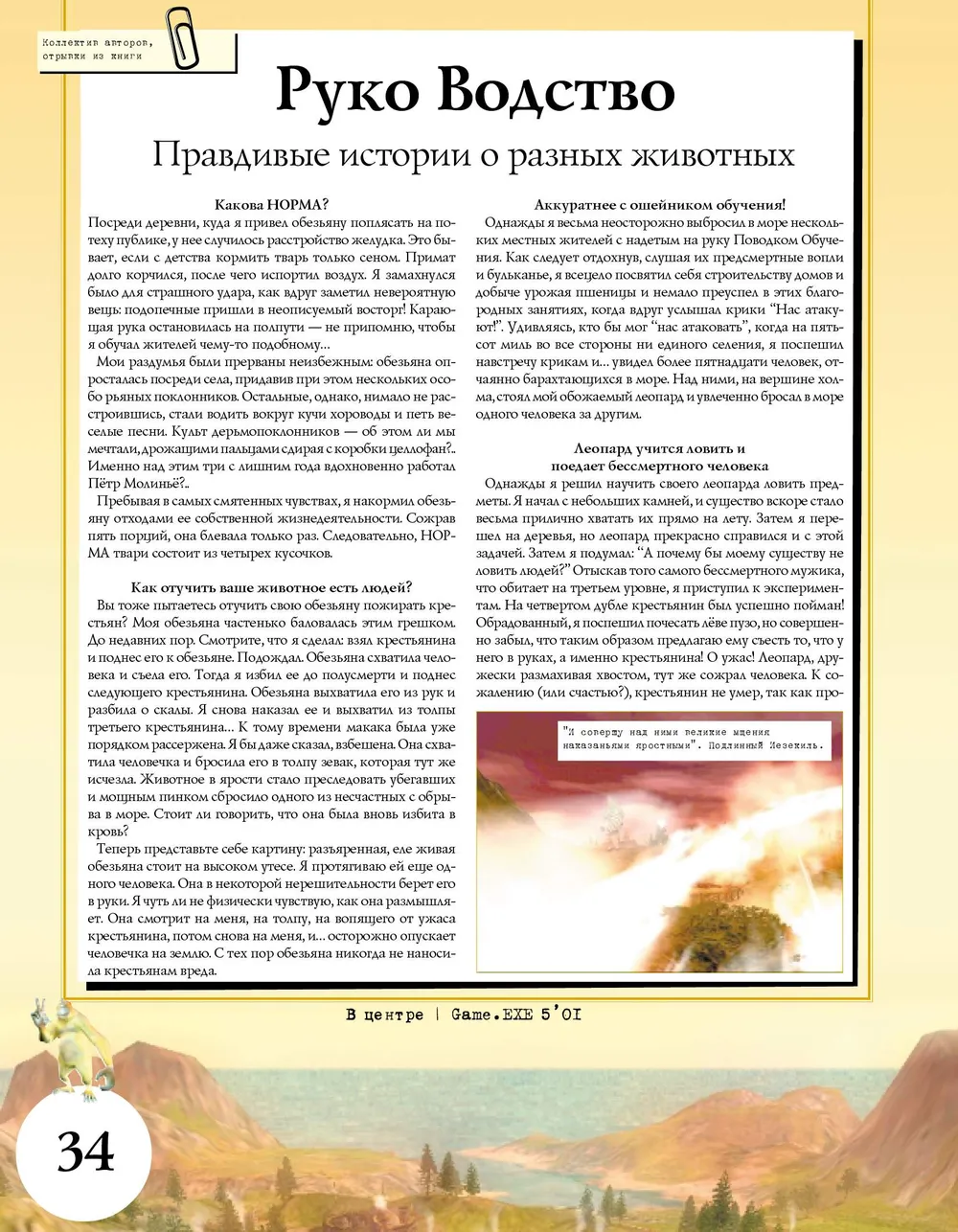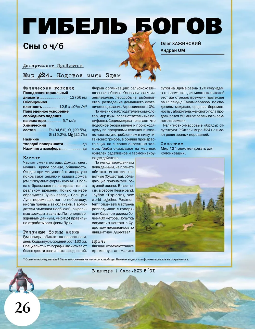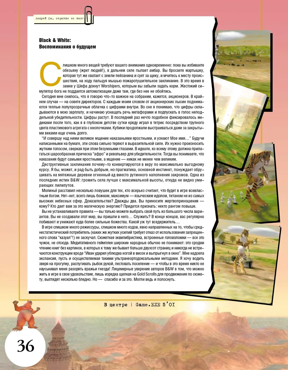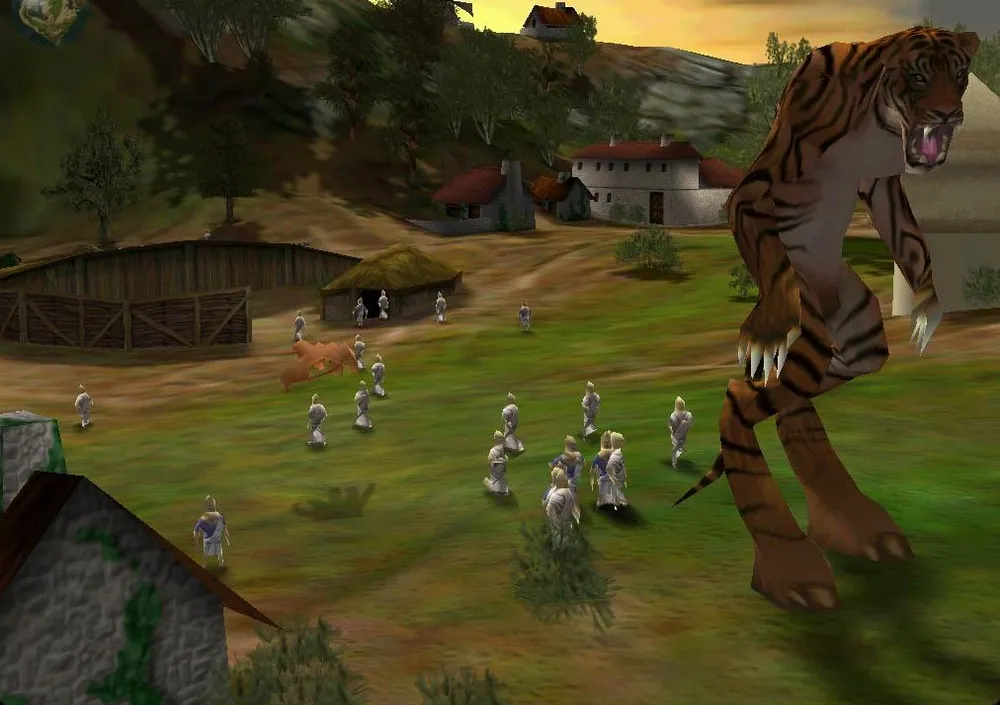 Ну там еще были и добрые дела. Но это было скучным. Строй дома, корми, собирай деревья. А потом, когда население твоего города становится огромным, ты всю силы веры обрушиваешь на вражеский город, УХАХАХАХА!!! гениальным на тот момент еще было существо. Все японцы завидовали этому тамогочи. Оно постоянно на твоих глазах находилось, но все равно незаметно, т.е. вот оно было маленьким, а через какое-то время оно переросло тотем. Когда оно успело?! Или его внешность. В зависимости от его поступков внешность менялась все так же незаметно для глаза. Это было непередаваемо, будто и взаправду живое. Многие тогда хвалили проработку "глаз" существ. К нему привязываешься. Когда в конце игры оно **** ... жалко. Таких "неподдельных" эмоций ни одна игра не могла вызвать. Это была не просто модель с АИ, это было то, что росло и развивалось на твоих глазах. Оно танцевало перед жителями деревень. САМОСТОЯТЕЛЬНО захватывала вражеские города. Кормила, обеспечивала, лечила нуждающихся. Попробуйте обучить тигра лучу смерти второго уровня. Но после 263 продемонстрированных заклинаний эта тварь умудрилась самотоятельно его повторить. Ты одеваешь на него ошейник агрессии, оно пошло сеять хаос и разрушение, боль и унижение, и ... и в его характеристиках 100% превратилось в 99%. Эта тварь забыла чему его учили!!! Минимализм цифр способствовал полному погружению в игру. Заклинания создавались движением мыши, ты взаправду ощущал себя Богом. Погрузившись, ты начинал напрягать свою фантазию. Как бы еще поэксперементировать, что еще сделать, чтобы понаблюдать за процессом. Вспоним бессмертного человека на третьей карте. Как только каждый из нас не пытался его убить. Доходило до того, что его просто тупо скармливали существу. Прошло время и ты забыл про него. Так нет!!! Ты приучил существо справлять нужду в городской тотем и вместе с фикалиями выходит ОН!!!