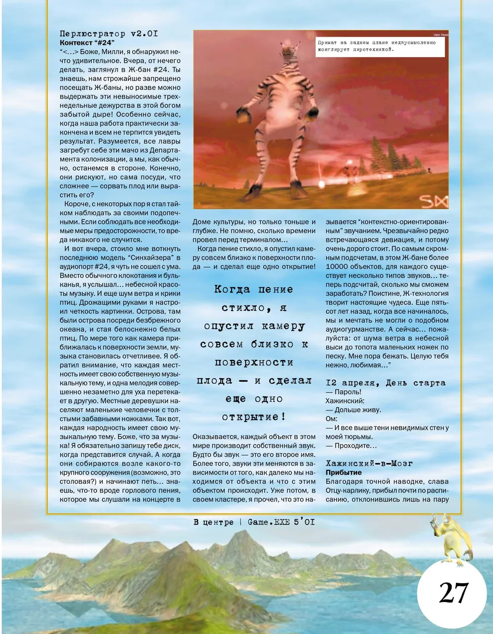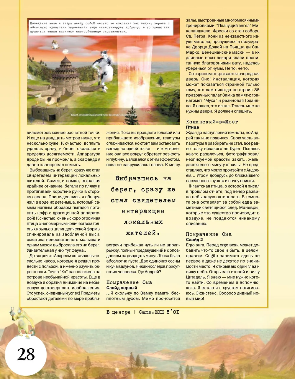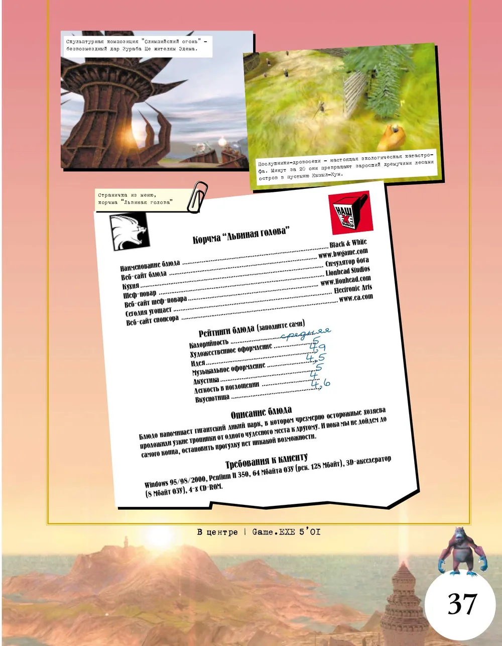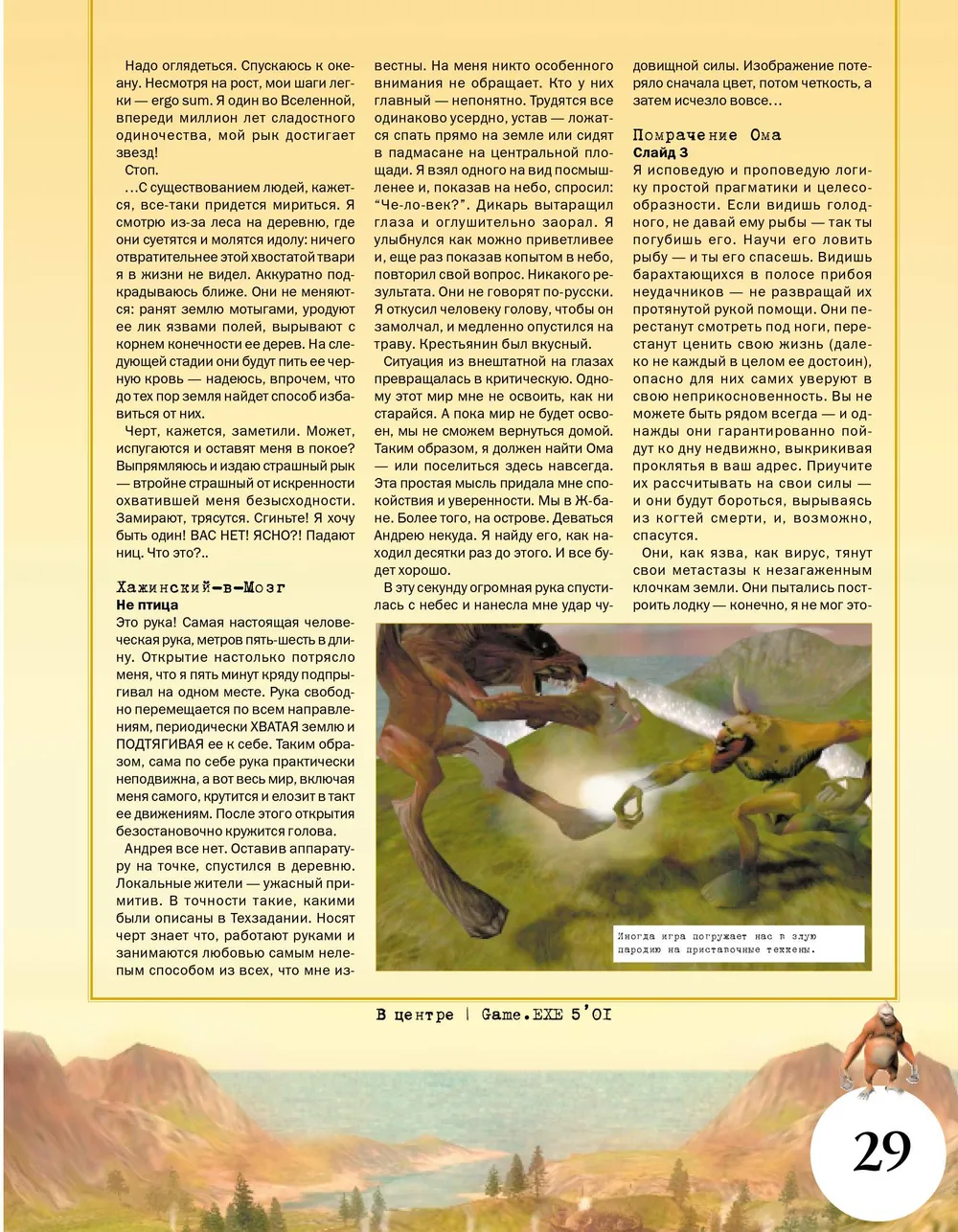 Ну там еще были и добрые дела. Но это было скучным. Строй дома, корми, собирай деревья. А потом, когда население твоего города становится огромным, ты всю силы веры обрушиваешь на вражеский город, УХАХАХАХА!!! гениальным на тот момент еще было существо. Все японцы завидовали этому тамогочи. Оно постоянно на твоих глазах находилось, но все равно незаметно, т.е. вот оно было маленьким, а через какое-то время оно переросло тотем. Когда оно успело?! Или его внешность. В зависимости от его поступков внешность менялась все так же незаметно для глаза. Это было непередаваемо, будто и взаправду живое. Многие тогда хвалили проработку "глаз" существ. К нему привязываешься. Когда в конце игры оно **** ... жалко. Таких "неподдельных" эмоций ни одна игра не могла вызвать. Это была не просто модель с АИ, это было то, что росло и развивалось на твоих глазах. Оно танцевало перед жителями деревень. САМОСТОЯТЕЛЬНО захватывала вражеские города. Кормила, обеспечивала, лечила нуждающихся. Попробуйте обучить тигра лучу смерти второго уровня. Но после 263 продемонстрированных заклинаний эта тварь умудрилась самотоятельно его повторить. Ты одеваешь на него ошейник агрессии, оно пошло сеять хаос и разрушение, боль и унижение, и ... и в его характеристиках 100% превратилось в 99%. Эта тварь забыла чему его учили!!! Минимализм цифр способствовал полному погружению в игру. Заклинания создавались движением мыши, ты взаправду ощущал себя Богом. Погрузившись, ты начинал напрягать свою фантазию. Как бы еще поэксперементировать, что еще сделать, чтобы понаблюдать за процессом. Вспоним бессмертного человека на третьей карте. Как только каждый из нас не пытался его убить. Доходило до того, что его просто тупо скармливали существу. Прошло время и ты забыл про него. Так нет!!! Ты приучил существо справлять нужду в городской тотем и вместе с фикалиями выходит ОН!!!