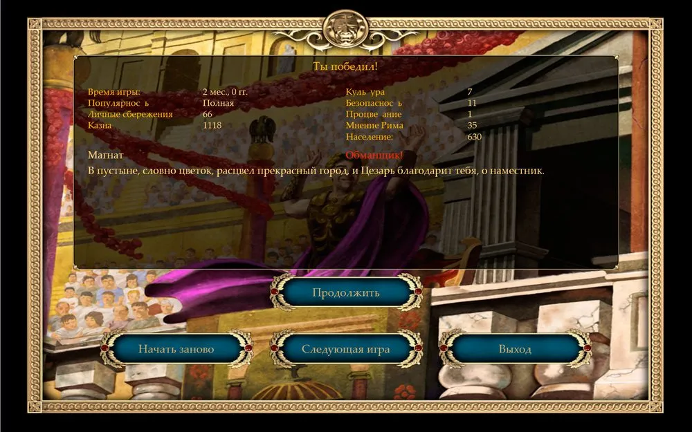При использовании кодов после завершения сценария выводится надпись "Обманщик".
