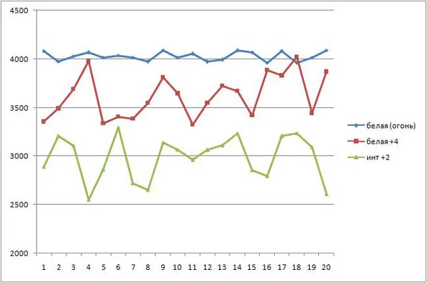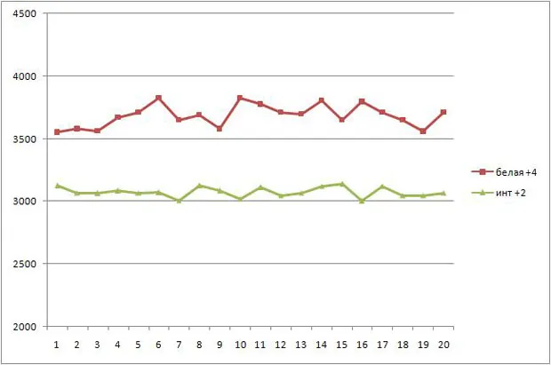 Видно, что средний урон под баффами интовой брони практически такой же как у брони белой, но при этом максимальное и минимальное значения урона у интовой брони значительно ниже. Я считаю, что в данном случае сыграл шутку Корейский Рэндом, и, в действительности, если провести больше опытов, то разница между интовой броней и белой окажется куда более значительной. Но как уж есть, и здесь с бафами интовая броня превосходит белую всего на 1.5%. Без бафов отрыв получается куда более значительный - по белой броне удары в среднем сильнее на 15%