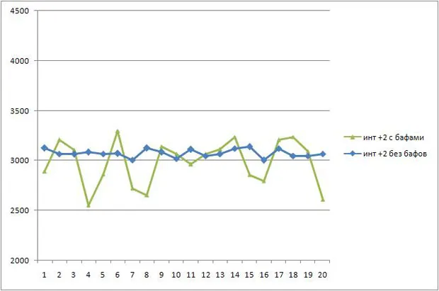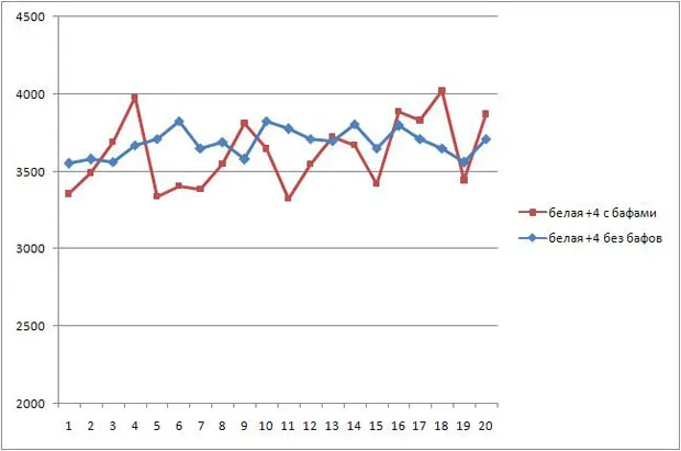 график без бафов колеблется от 3552 до 3857, среднее значение 3686