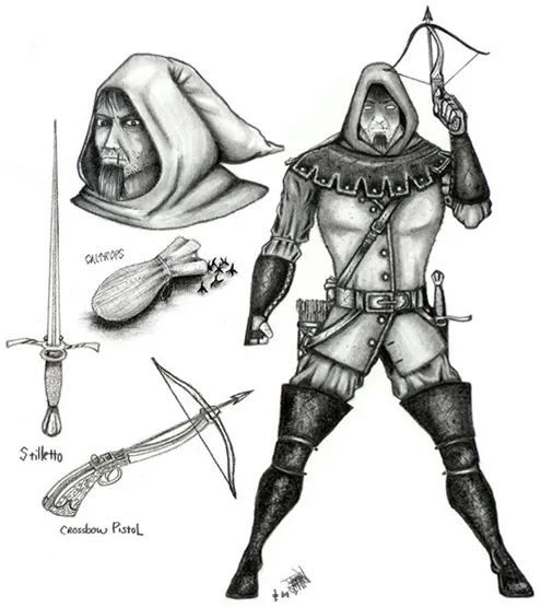 Основная атака: Выстрел из арбалета-пистолета. Надобности в прицеливании нет. В запасе 25 стрел.