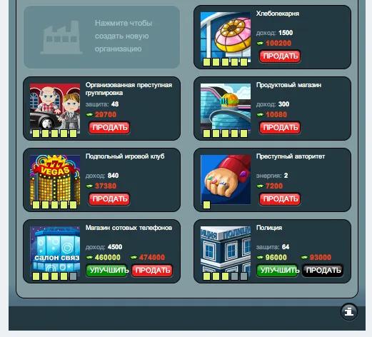 Защита — дополнительный бонус к защите при атаке на тебя других игроков. Считается сумма всех защитных построек, вне зависимости от числа членов коррупционной цепочки.
