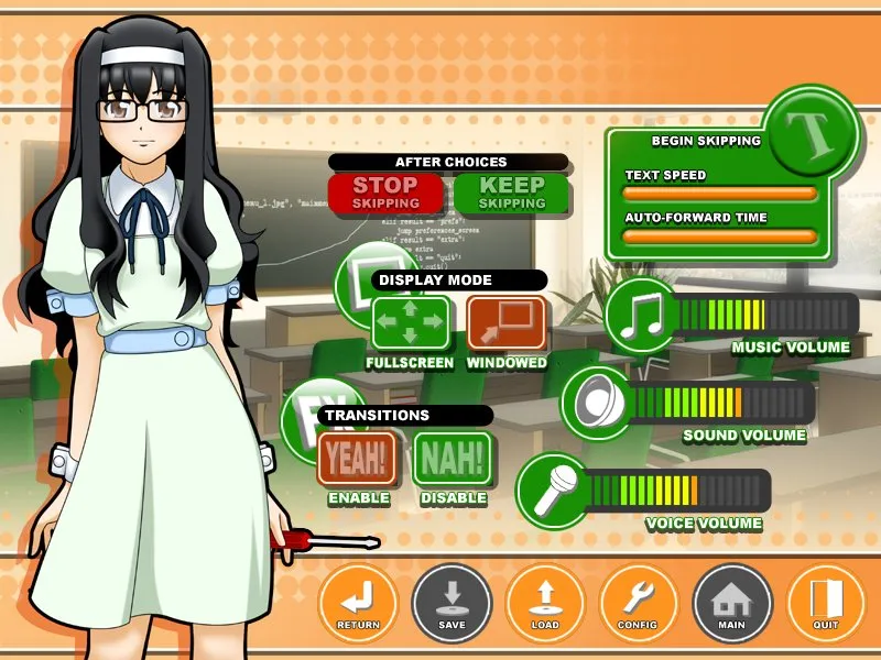 Ren'Py по умолчанию включает все возможности, которые игрок ожидает от визуальной новеллы. По желанию их можно отключить, но каждая новая игра будет иметь: