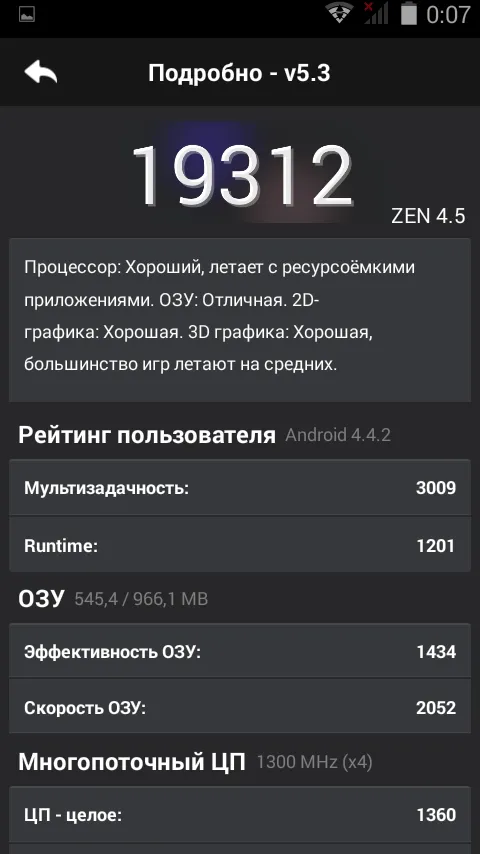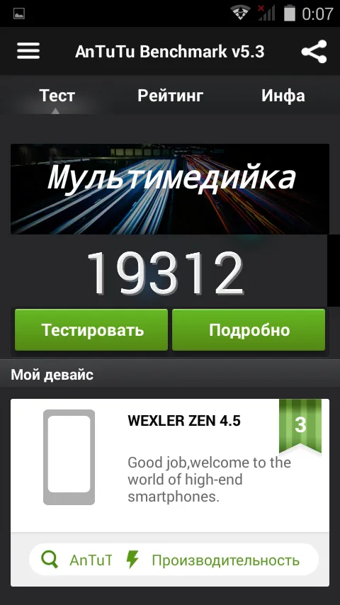 Бенчмарк AnTuTu отнес модель Wexler Zen 4.5 к рангу смартфонов с высокой общей производительностью, так как SoC MediaTek MT6582 имеет вполне неплохие характеристики.