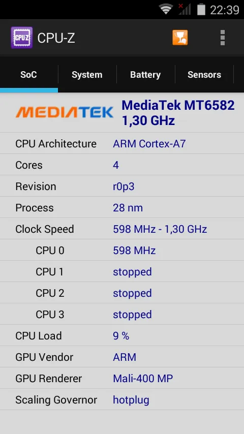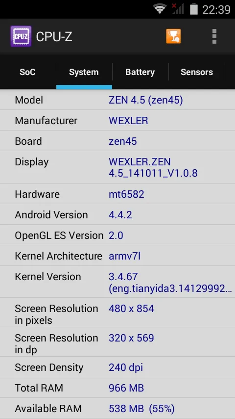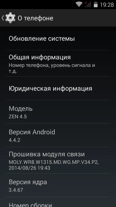 Теперь самое время посмотреть, что же у этого смартфона внутри. Аппаратная платформа базируется на SoC MediaTek MT6582, который работает совместно с графическим процессором Mali-400 MP2. Центральный ARM-процессор (Cortex A7) работает на частоте 1,3 ГГц, при этом часть ядер, если в них нет необходимости, могут быть не активными, что снижает энергопотребление. Двухъядерный графический процессор Mali-400 MP2 работает на частоте 400 МГц. В смартфоне WEXLER ZEN 4.5 присутствует хороший набор необходимых периферийных беспроводных модулей: Bluetooth 4.0 и Wi-Fi 802.11 b/g/n (частота 2,4 ГГц, с поддержкой Wi-Fi Direct, Wi-Fi Display). В качестве оперативной памяти используется LPDDR2-модуль объемом 1 Гбайт.