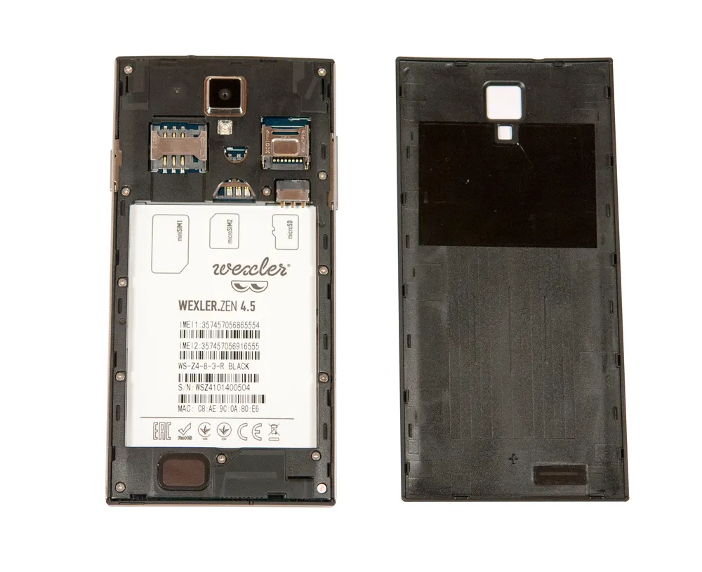 Обладателю WEXLER ZEN 4.5доступны два слота SIM (miniSIM и microSIM), а также слот для карт памяти microSD (поддерживаются карты SDHC объемом до 32 Гбайт). Сразу отметим, что оба модуля сотовой связи в этой модели могут быть активными, что позволяет пользоваться услугами разных операторов одновременно.