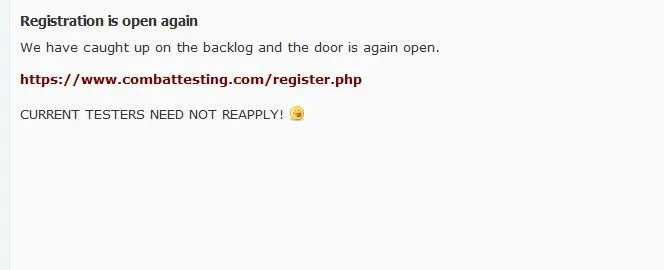 Combattesting после перерыва начал принимать в свои ряды добровольцев,желающих на своих солдатских спинах понести тяжелую ношу бетатестеров)