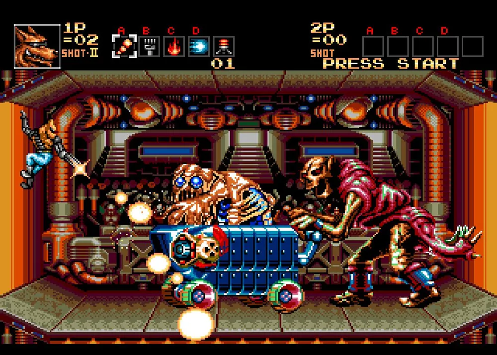 Второй босс — огромный монстр, мамаша с коляской. На коляске установлена пусковая установка, а из коляски иногда вылазите детина и пытается вас ударить. Займите положение в верхнем правом углу ринга, там вас не достанет ни одна атака. Стреляйте оттуда по диагонали вниз, сначала снесите ракетницу, а потом самого «ребенка», после чего добейте саму мамашу.